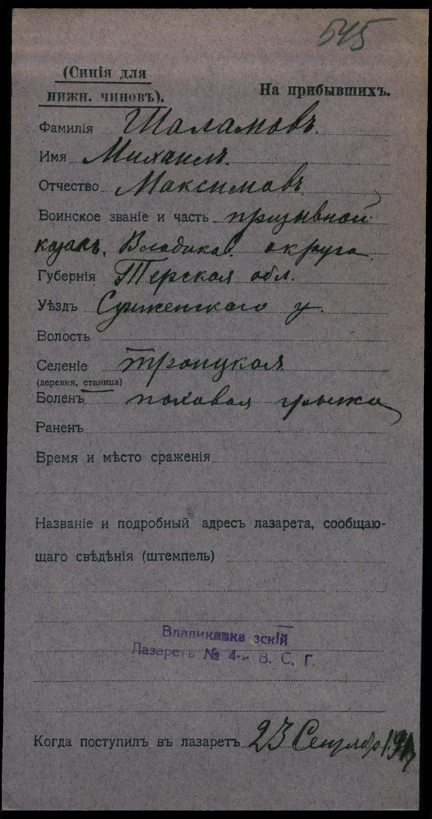 Ведомость Кавалерам ст. Троицкой Сунженского отдела Терской области, отставным, запасного разряда, 2 и 3 очереди и состоящим на действительной службе в строевых частях и разных учреждениях (Рапорт №2070 от ?.07.1897г.) лл.76-79 (ЦГА РСО-Алания ф.20,оп.1, д.2905, л.129)