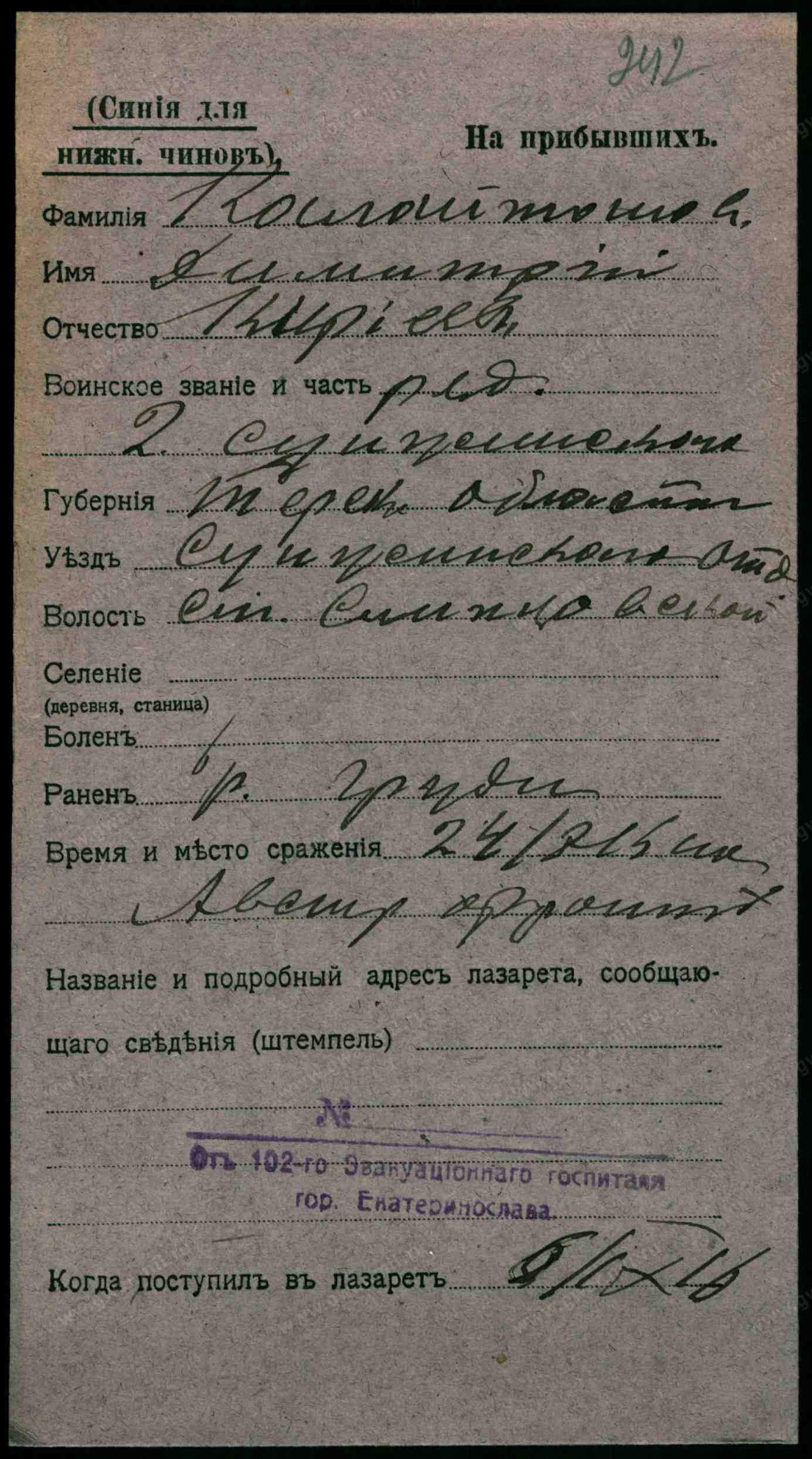Рядовой, __.__.1918 Грозненская обл., Сунженский р-н, д. Слепцовская, Место службы: 44 див. 146 сп