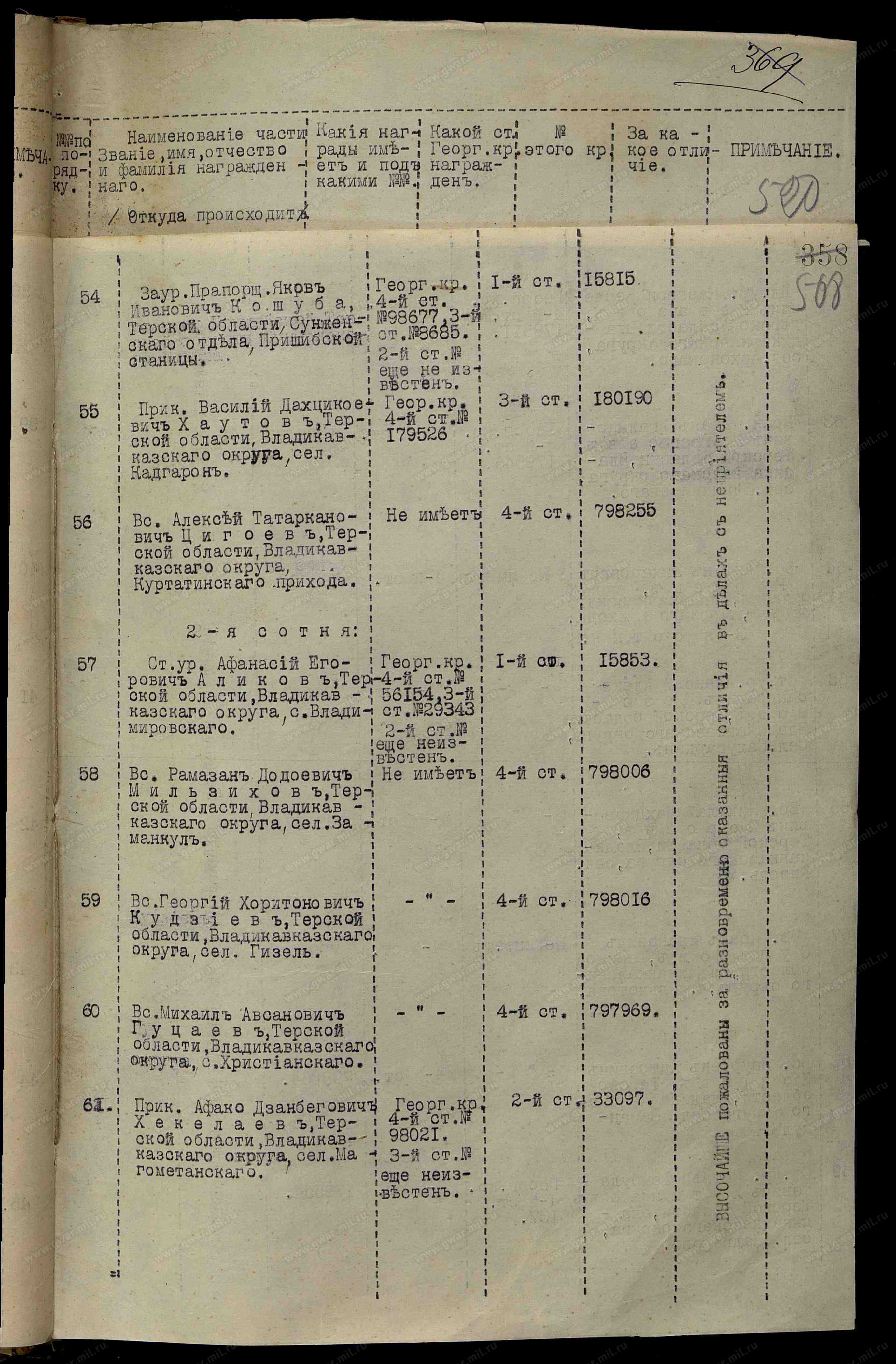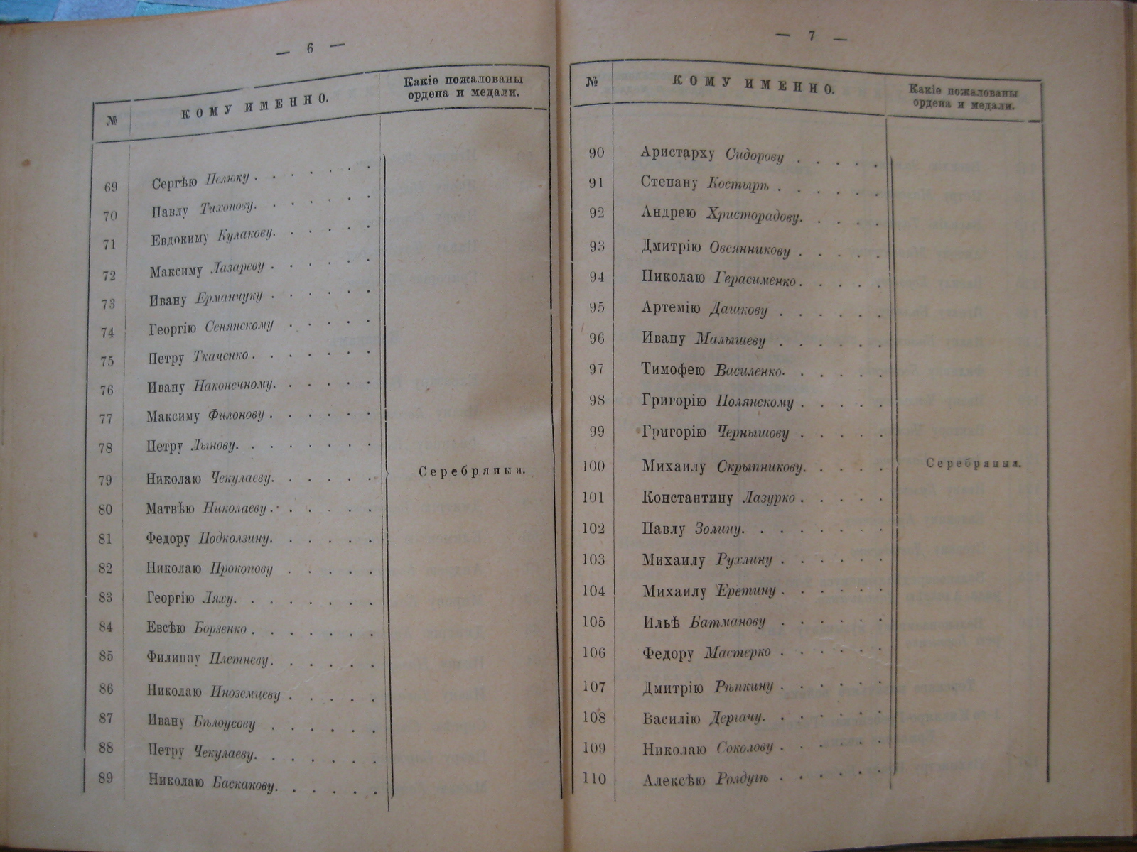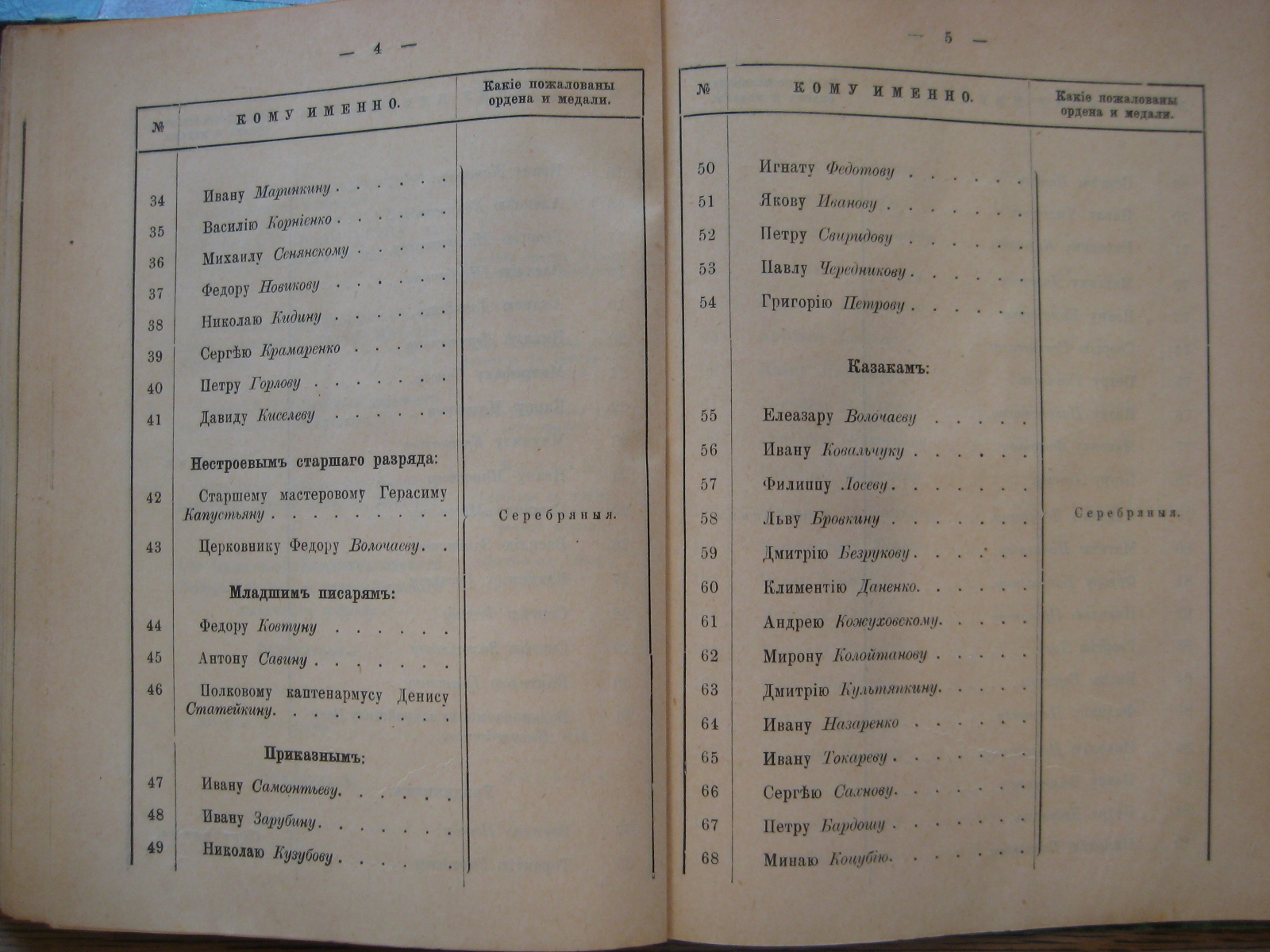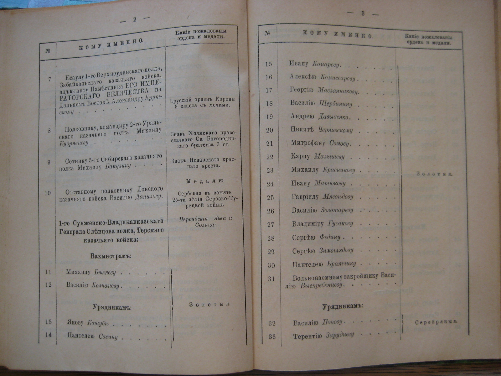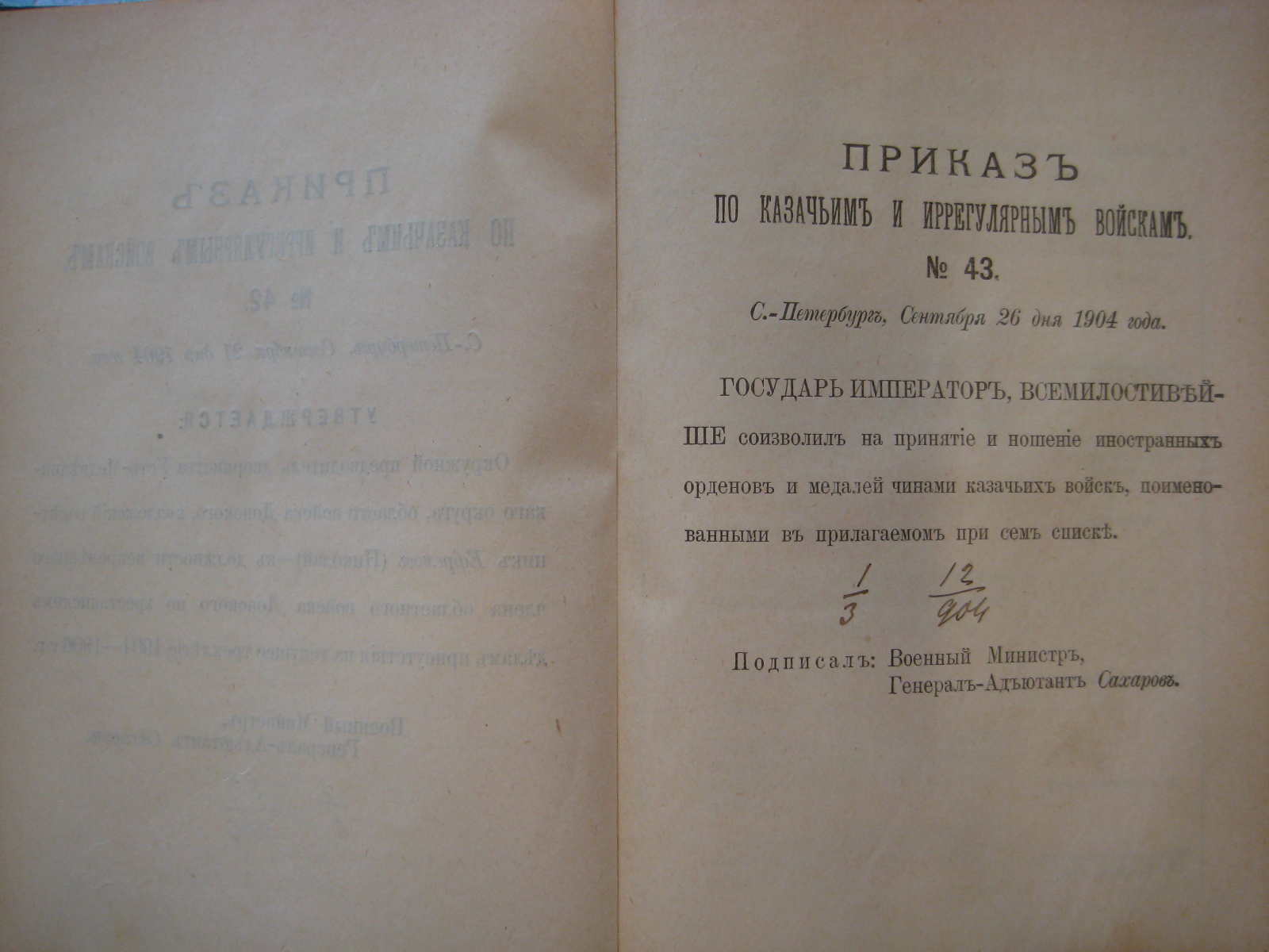 "При сем объявляю для сведения список казаков Терского Казачьего Войска, награжденных знаками отличия Военного ордена в войну с Японией и получившие подарки от Войска,, установленный приказом по Войску за № 203 1905 года..."