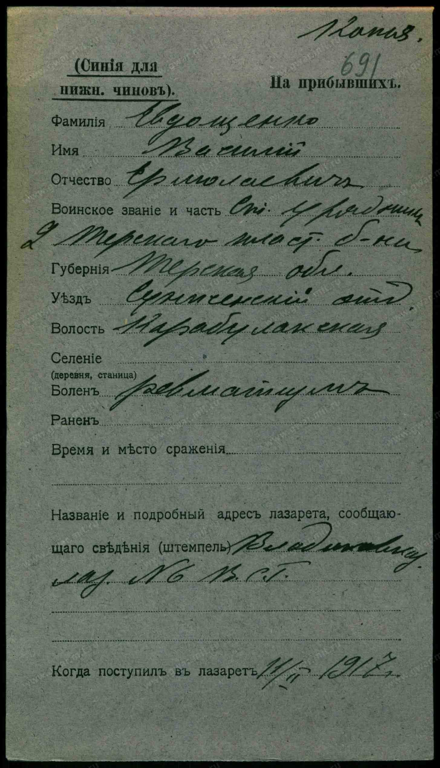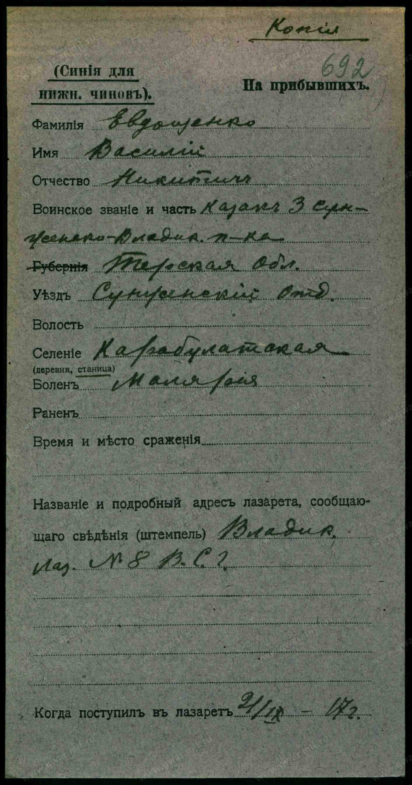 Призывник, __.__.1927 Северо-Осетинская АССР, Малгобекский р-н, ст. Вознесенская. ВПП и ЗП