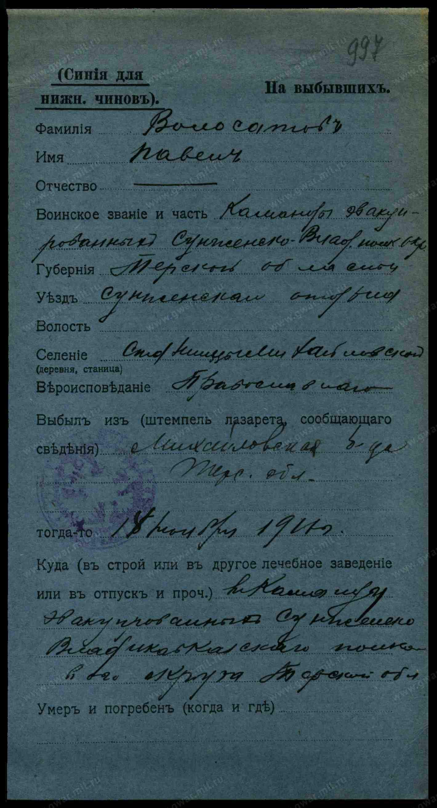 Место выбытия в команду эвакуированных Сунженско Владикавказского полкового округа Терской обл.