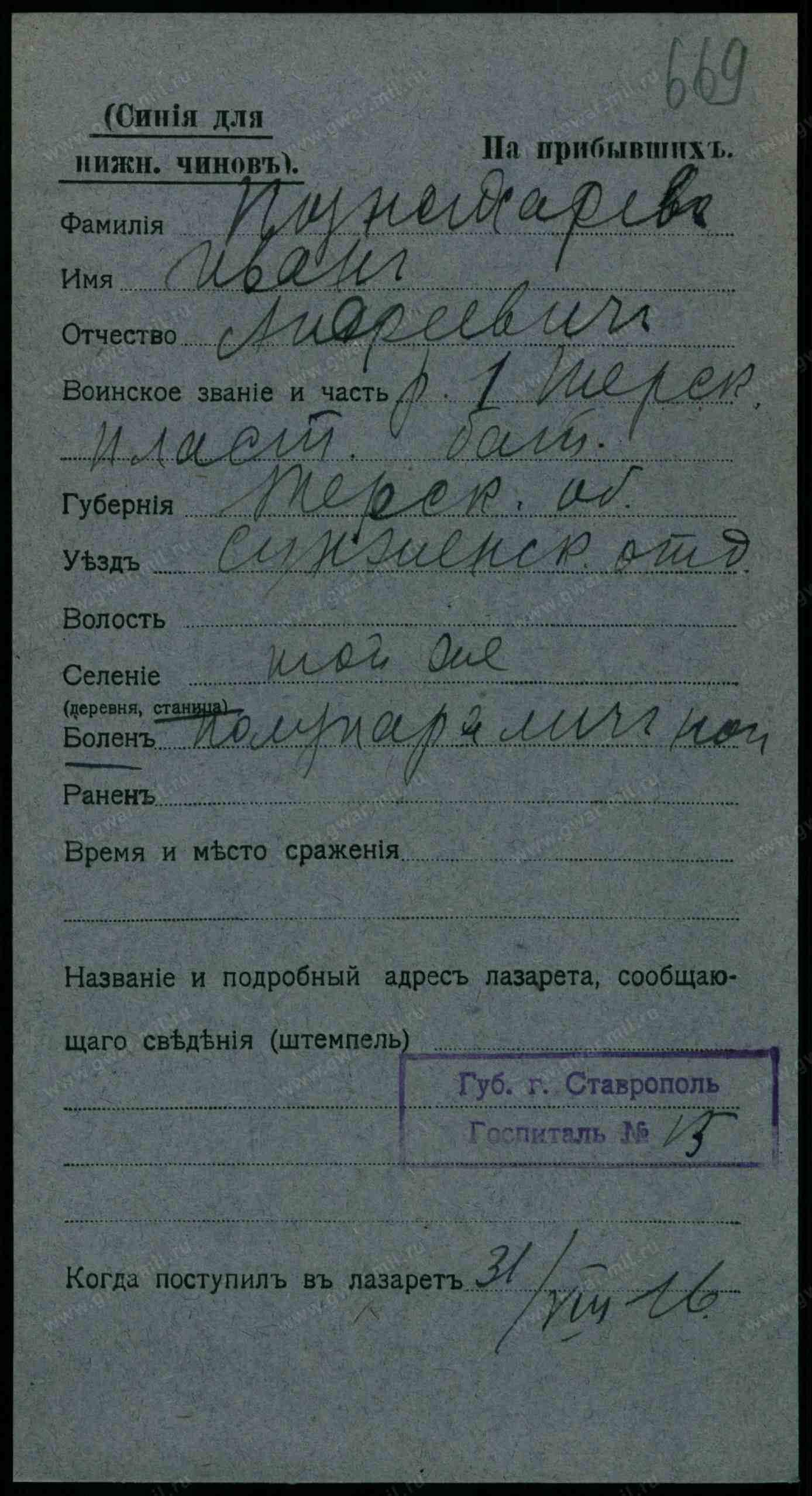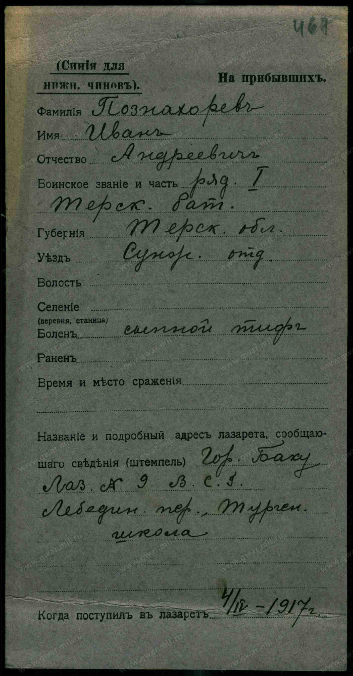 Тип документа Карточка на прибывших (нижние чины)