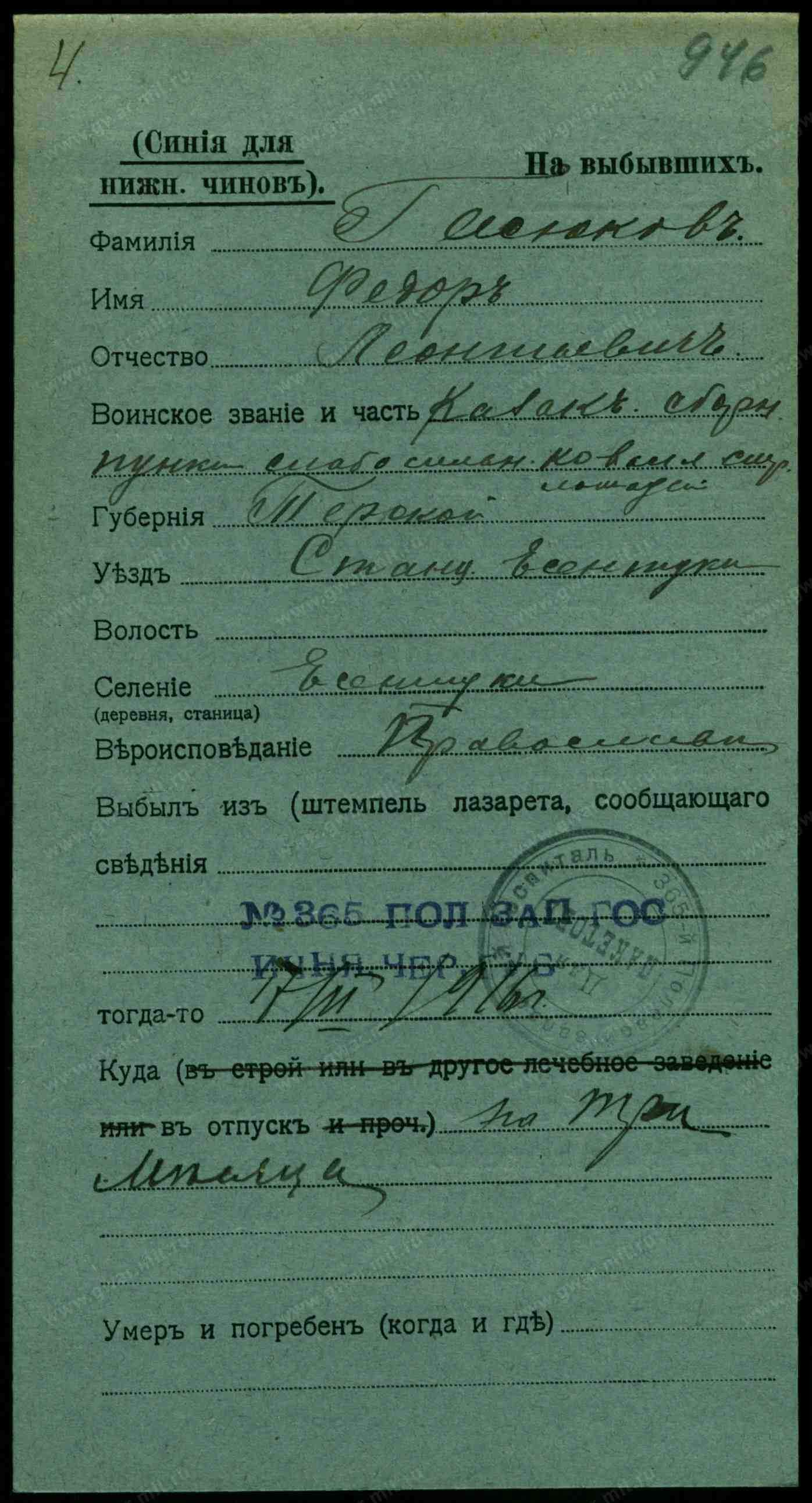 Родился в 1870 г., ст. Ессентукская, Ставропольский край; русский; Проживал: п. Ленва, Березниковский р-н, Уральская обл..