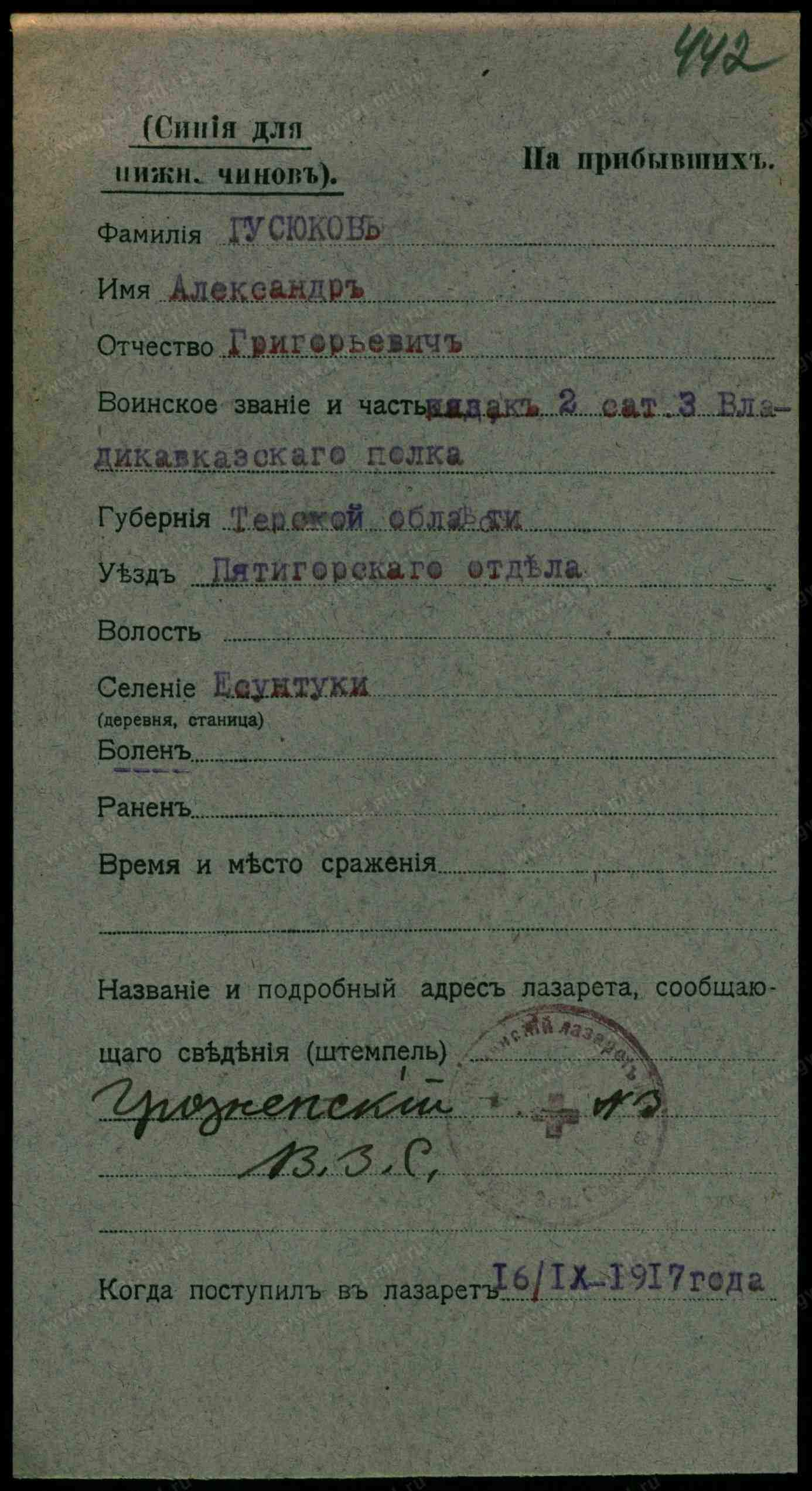 Место рождения Терская обл., Ессентукская станица, ст. Ессентукская