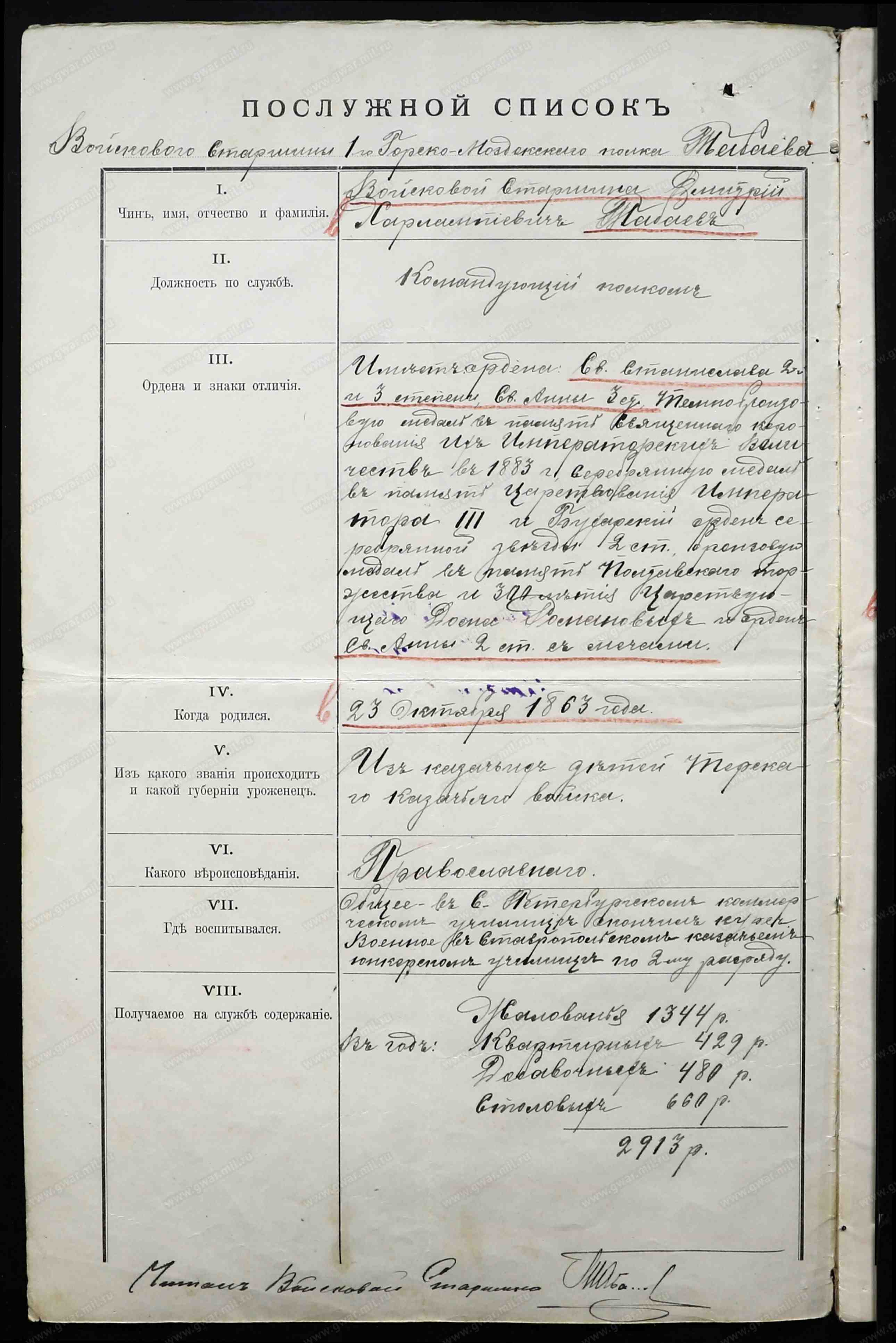 Объявляю по ввѣренному мнѣ войску для свѣдѣнія и надлежащаго, до кого относится, исполненія, списокъ нижнимъ чинамъ, командированнымъ въ минувшемъ Маѣ мѣсяцѣ въ С.-Петербургъ на укомплектованіе Л.-Гв. 3-й и 4-й Терскихъ казачьихъ сотенъ Собственнаго ЕГО ИМПЕРАТОРСКАГО ВЕЛИЧЕСТВА конвоя, предлагаю взамѣнъ людей, командированныхъ въ гвардейскія сотни оть строевыхъ частей, назначить изъ первоочередныхъ молодыхъ казаковъ и теперь же выслать: отъ Кизлярскаго отдѣла въ 1-й Кизляро-Гребенской конный полкъ 8 человѣкъ и въ 1-ю Терскую конно-артиллерійскую казачью батарею 4 человѣка (конныхъ); отъ Сунженскаго отдѣла въ 1-й Сунженско-Владикавказскiй конный полкъ 8 человѣкъ и отъ Пятигорскаго отдѣла во 2-ю Терскую батарею 4 человѣка (конныхъ).