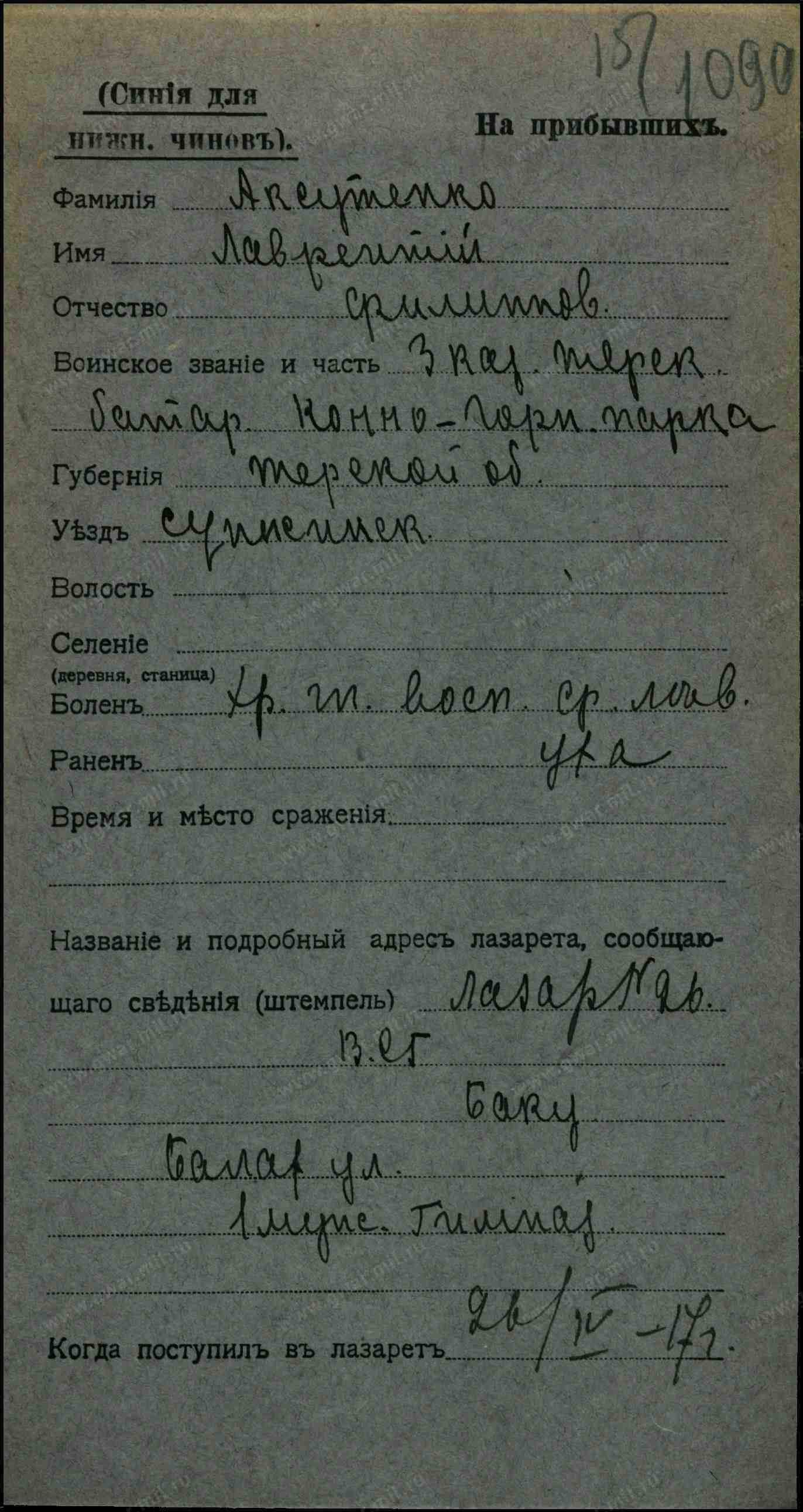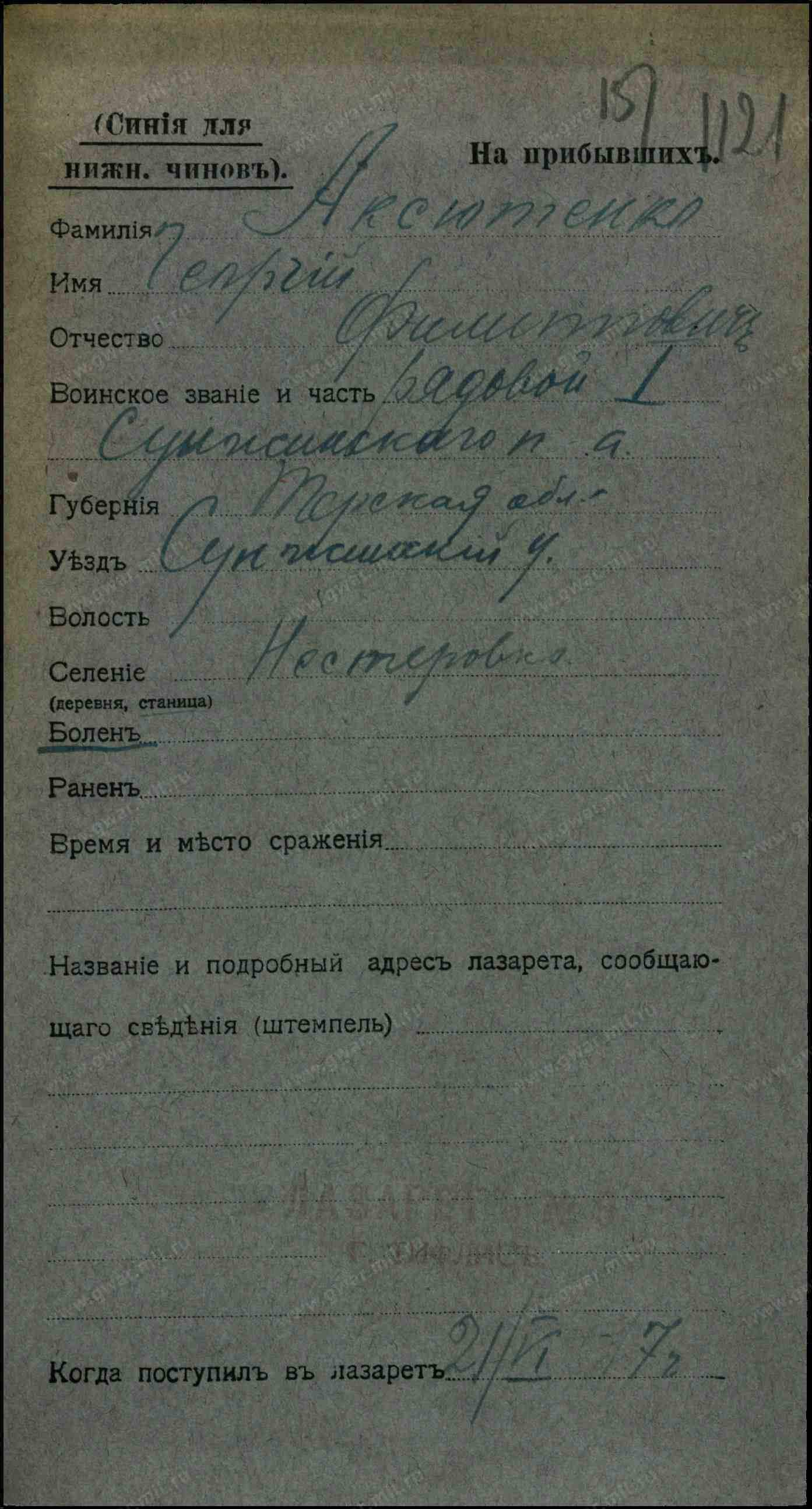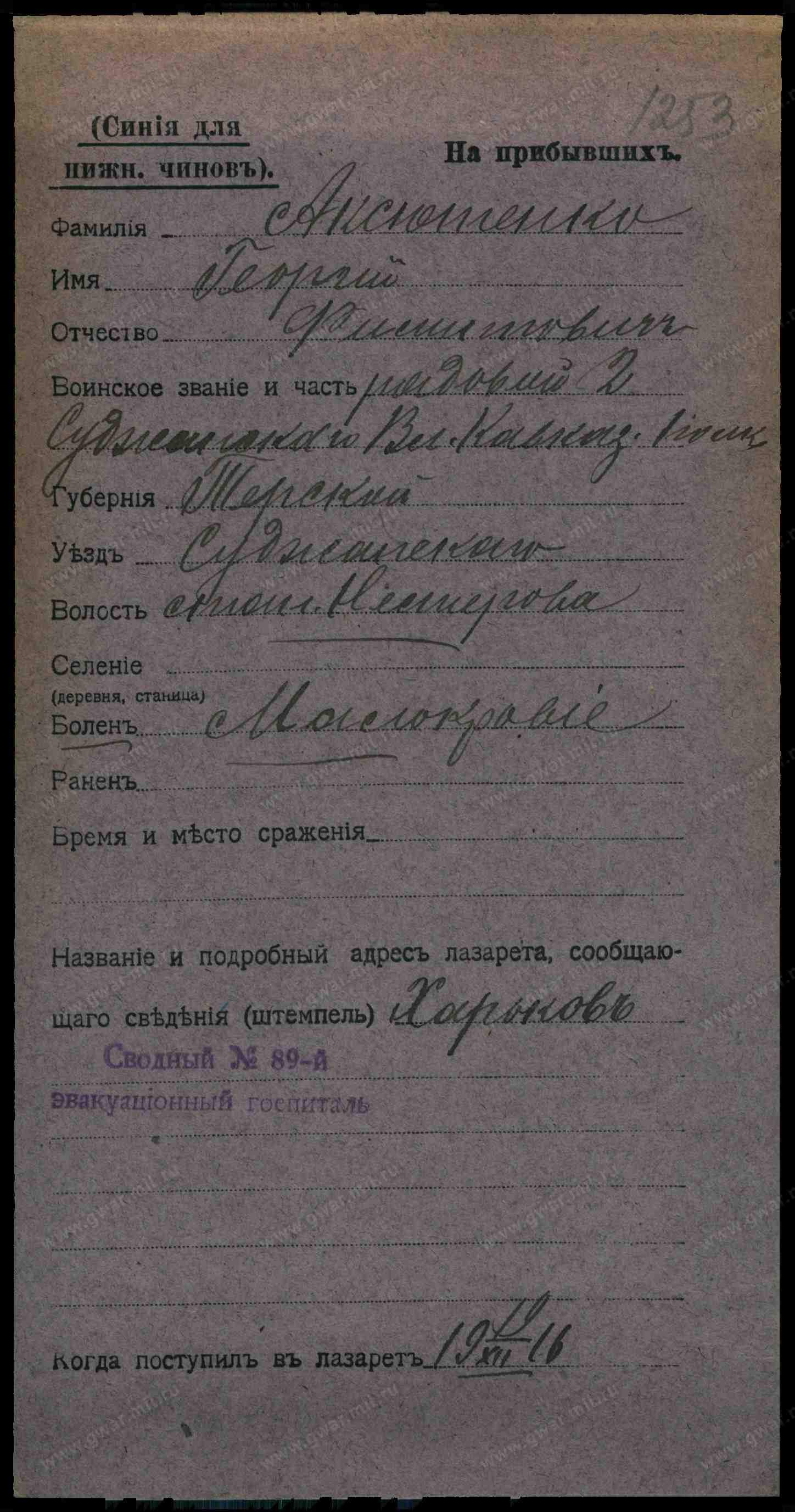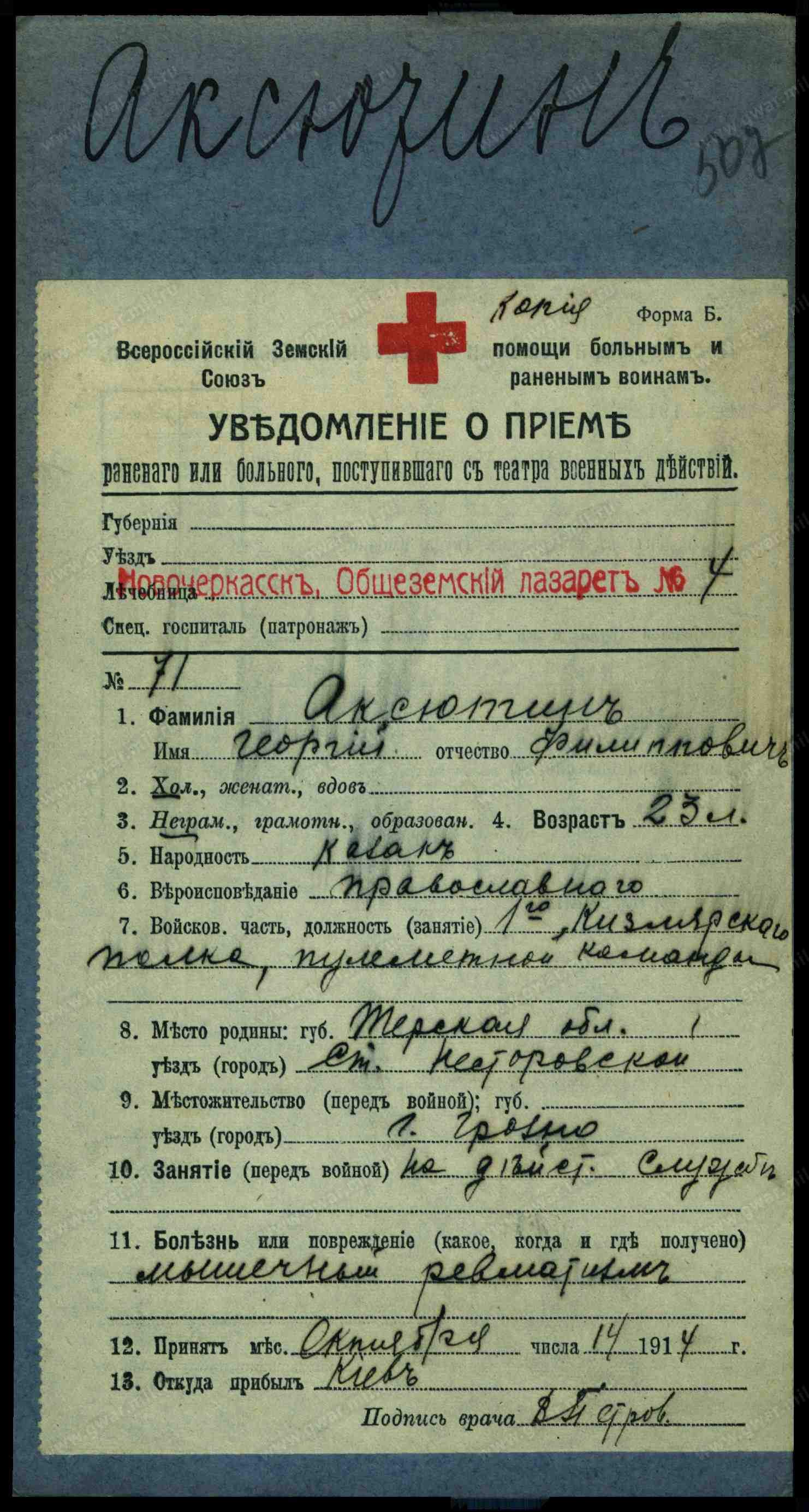 Место рождения Терская обл., Сунженский отдел, Нестеровская станица