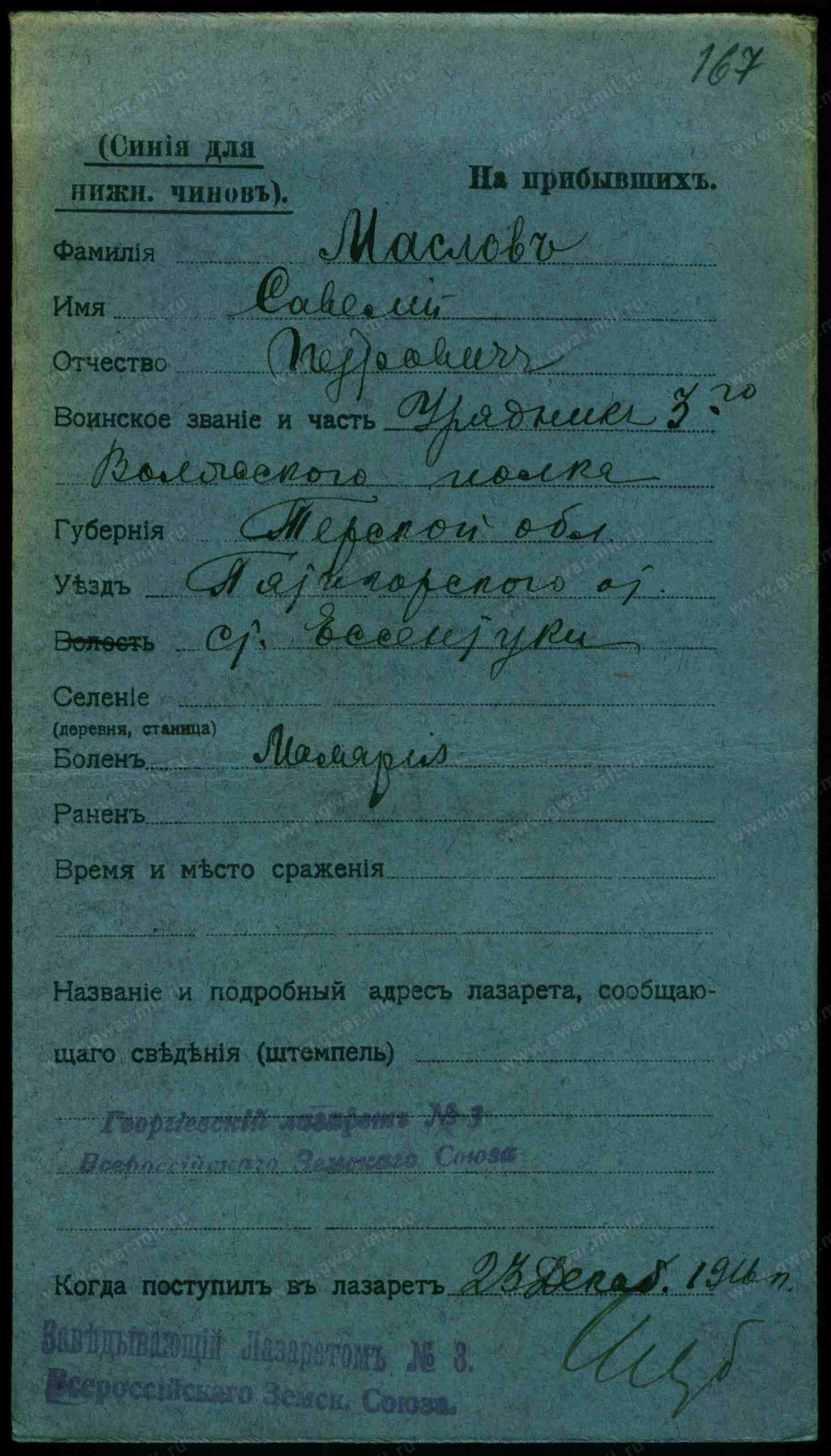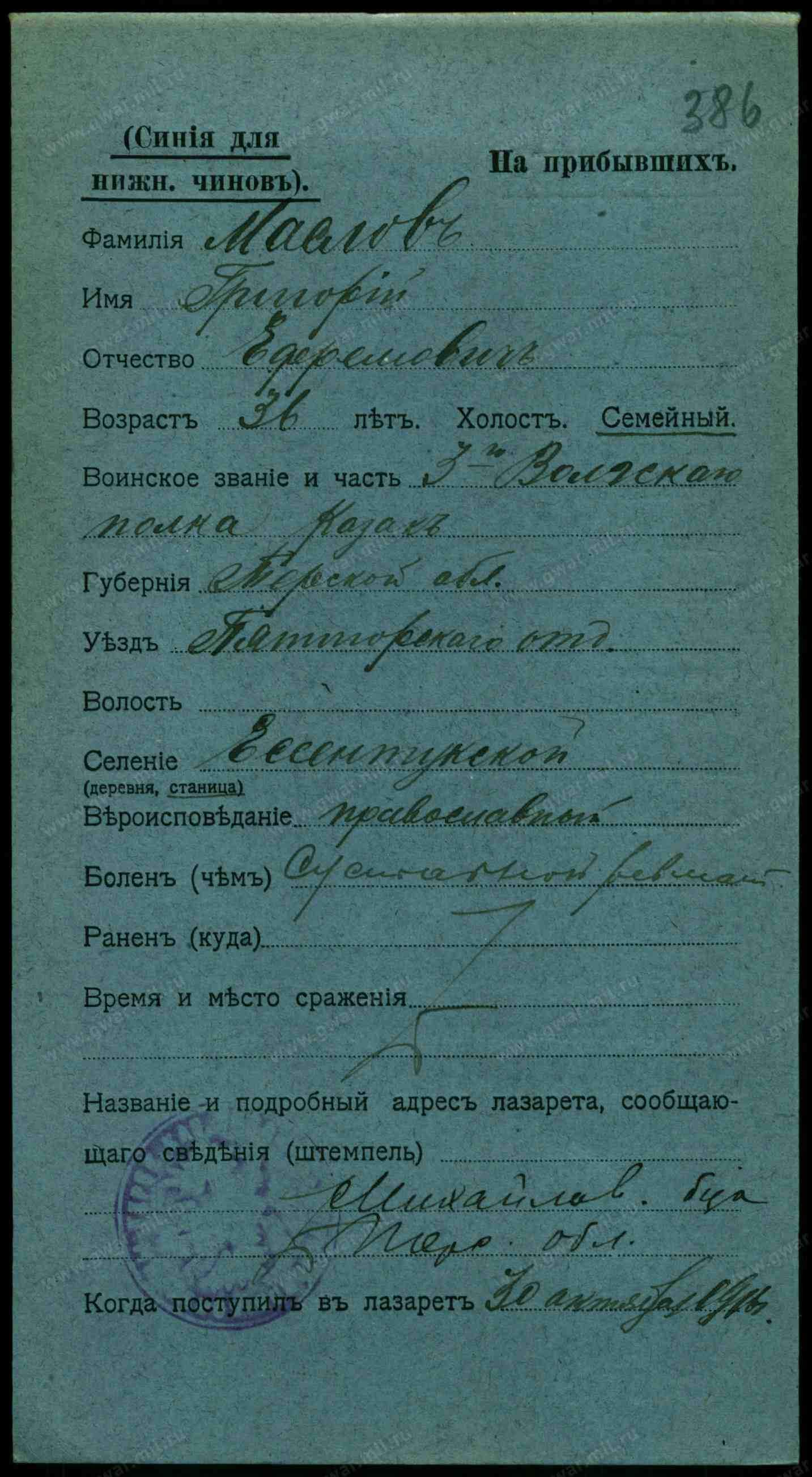 Место рождения Терская обл., Пятигорский отдел, Ессентукская станица