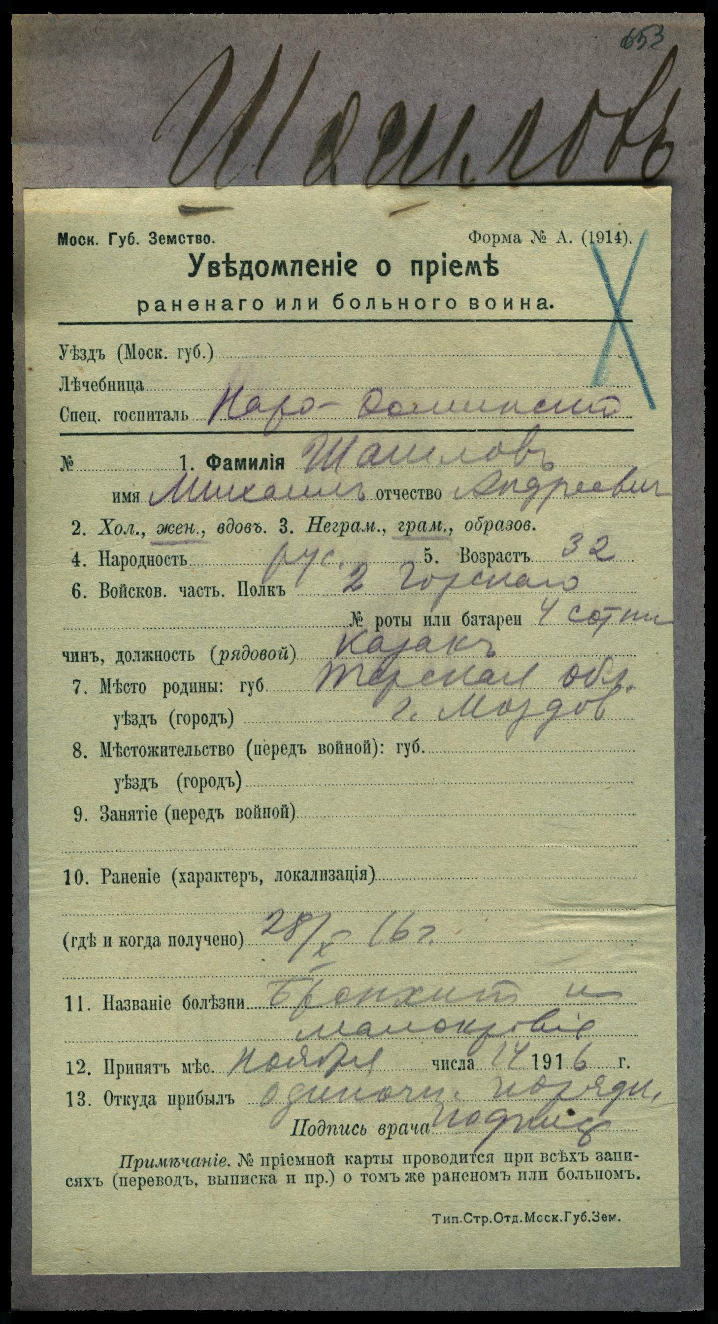 141132 Шашлов, Дмитрий Филиппов, 20 л. Каз. ст. Луковской, Моздокск. отд.; — Грозненск. С. М. С., 28 Апр. 911 (д. №105/910), 169 и 2 п. 170 М., тюр. 3 м. Исп. 29 Окт. 911.