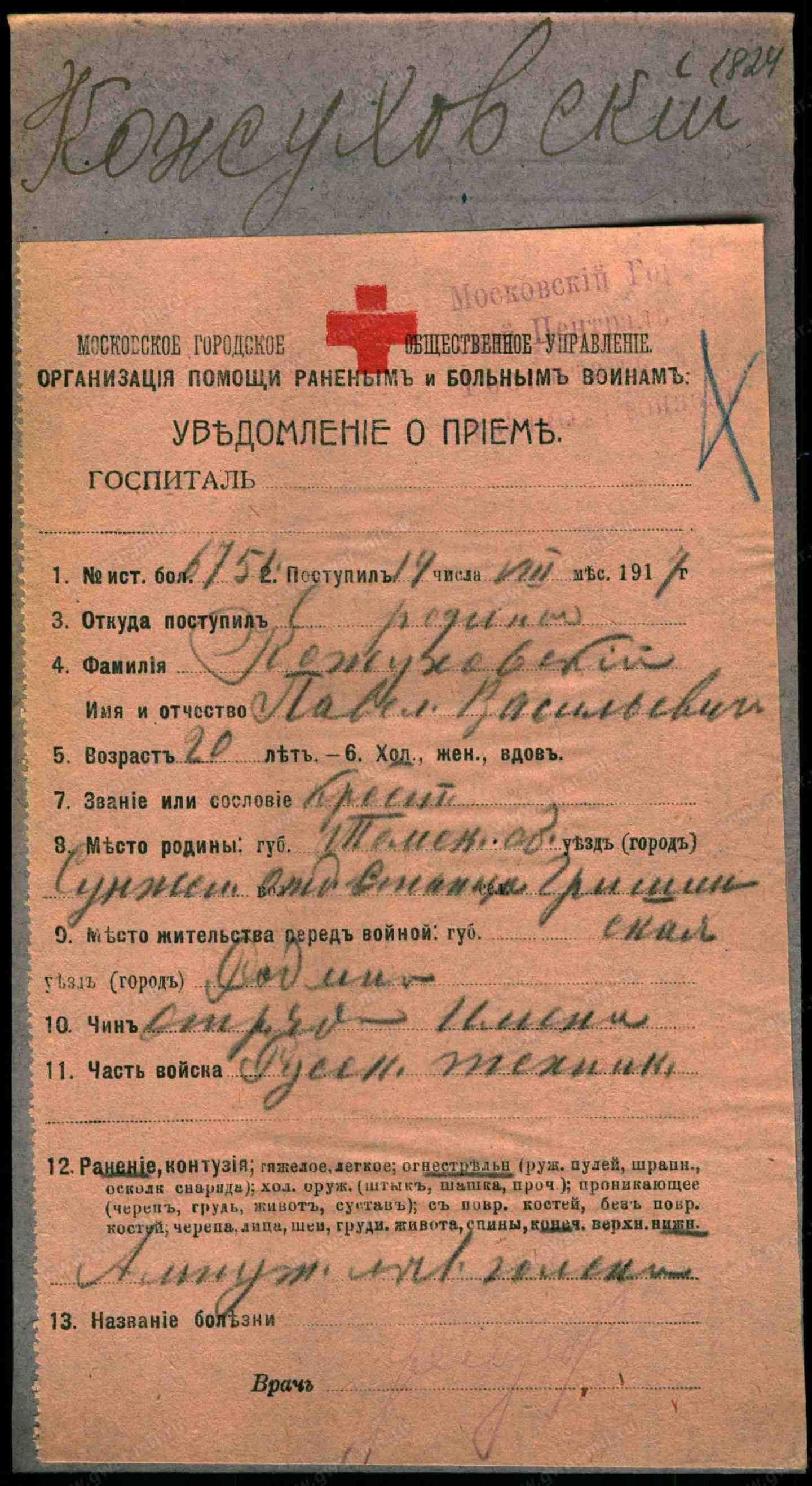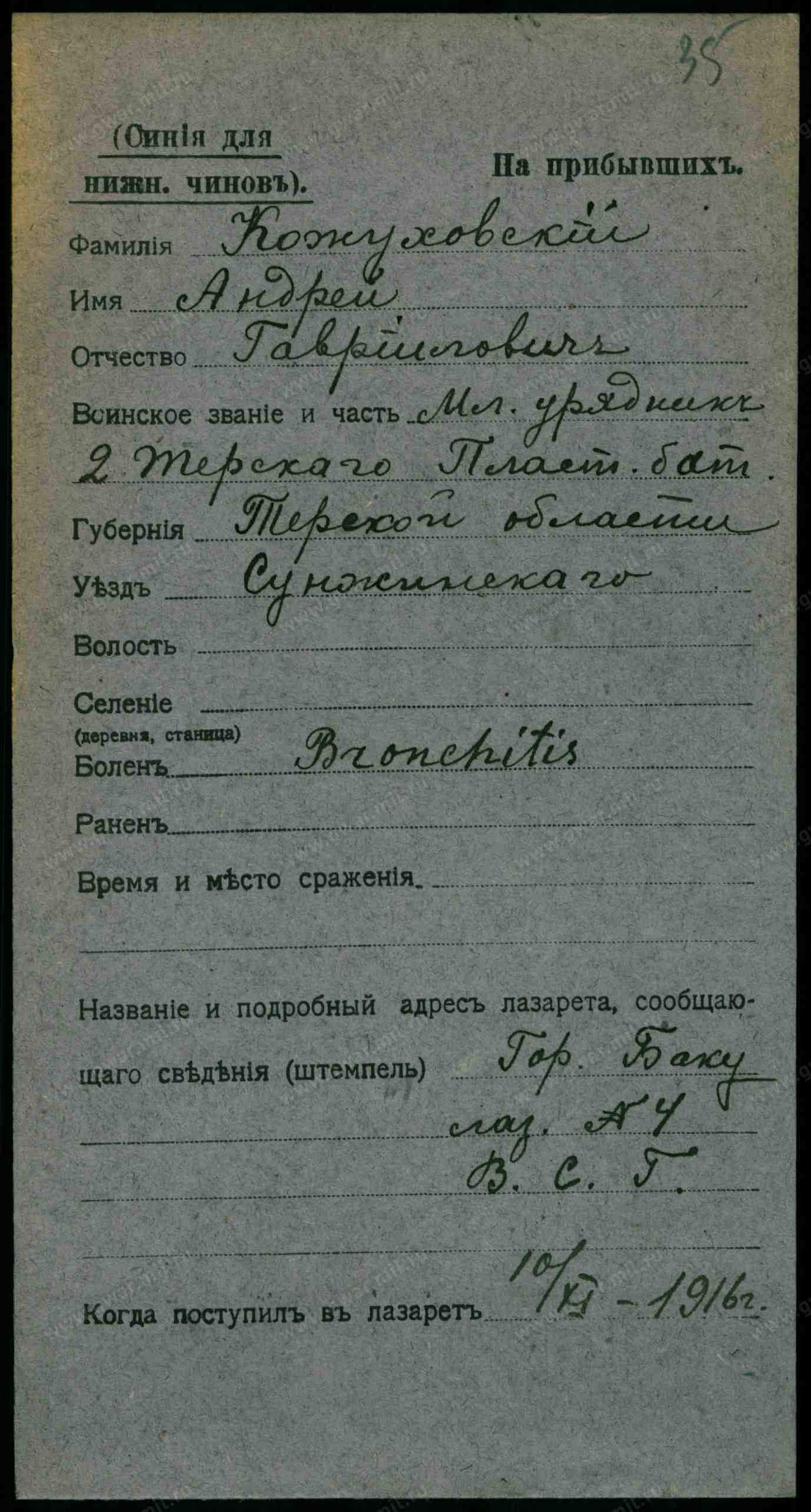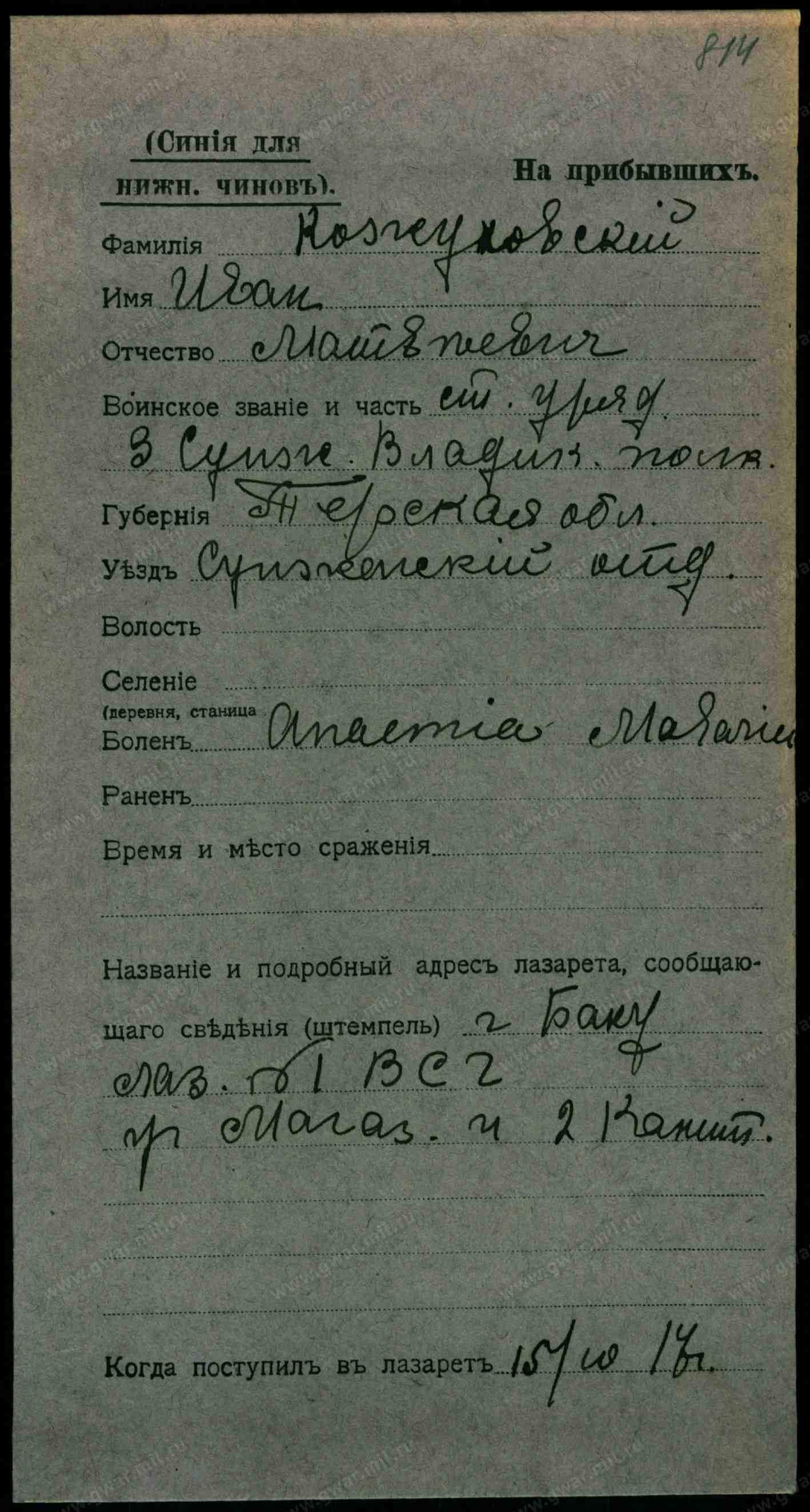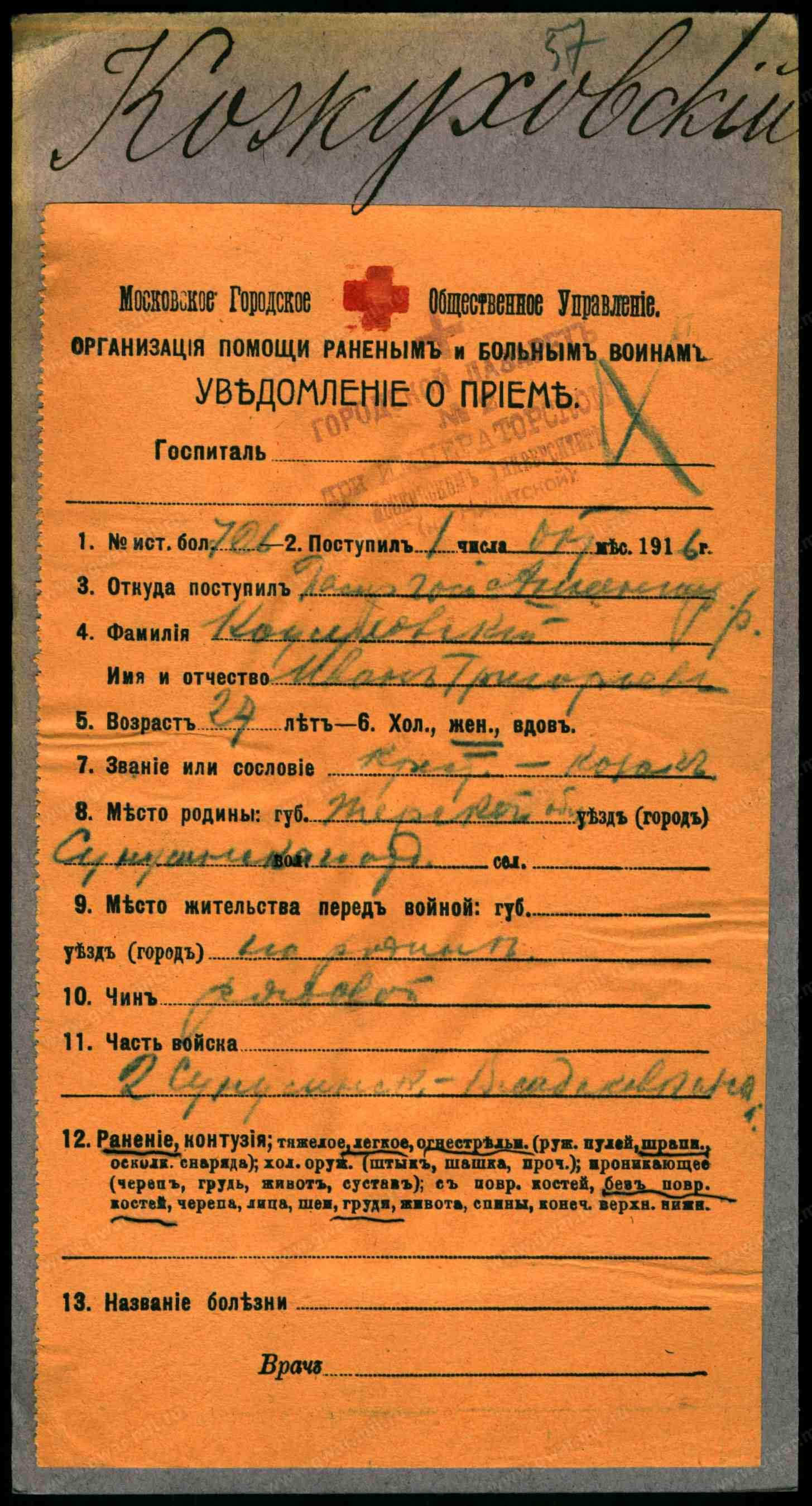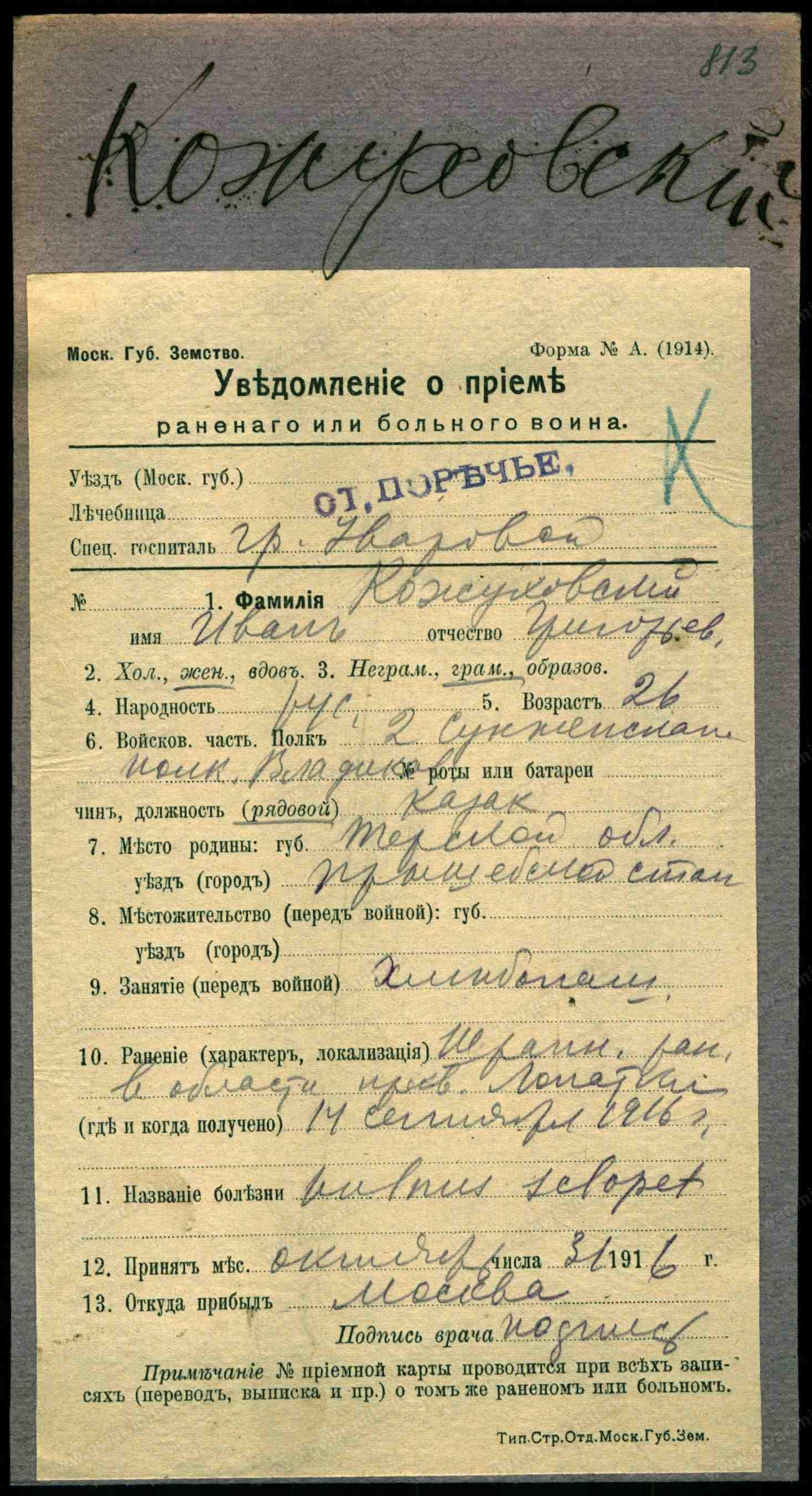 11 сентября 1911 года венчались: Рядовой Л.Г. Уланского Его Величества полка, из казаков Черниговской губ., Новозыбковского уезда, Лакомобудской волости, села Старого Кривца, Адриан Петрович Козлов 35 лет, православного вероисповедания, первым браком и казачка ст. Вознесенской, Терской обл., Сунженского отдела, Еликонида Трофимовна Комисарова 16 лет, православного вероисповедания, первым браком.