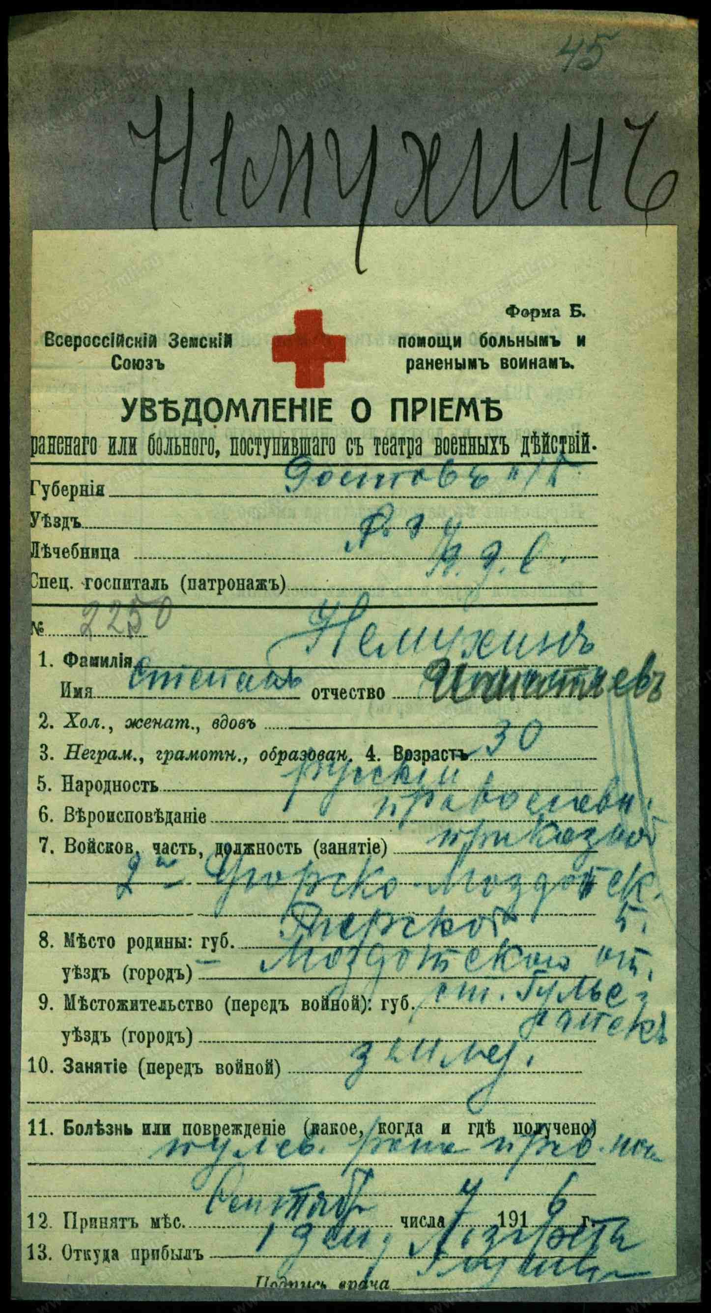 Родители: Урядник Галюгаевской станицы, Терской области, Алексей Иаковлев Немухин и законная жена его Александра Петрова, оба православного вероисповедания.
