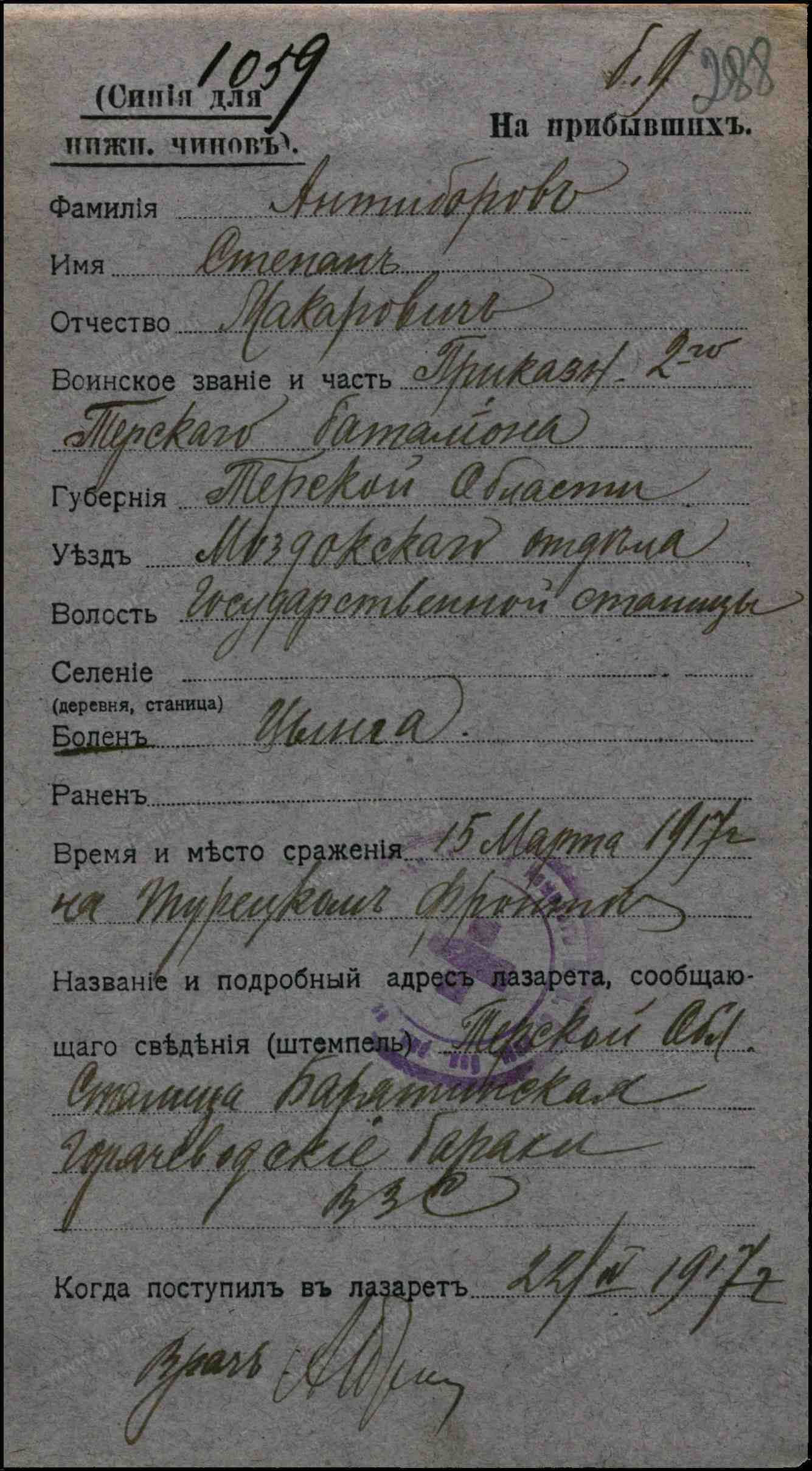 8.11.1914 г. умерла и 11.11.1914 г. погребена казачка ст. Государственной, Моздокского отдела Надежда Анцыбарова 29 лет, от свища.