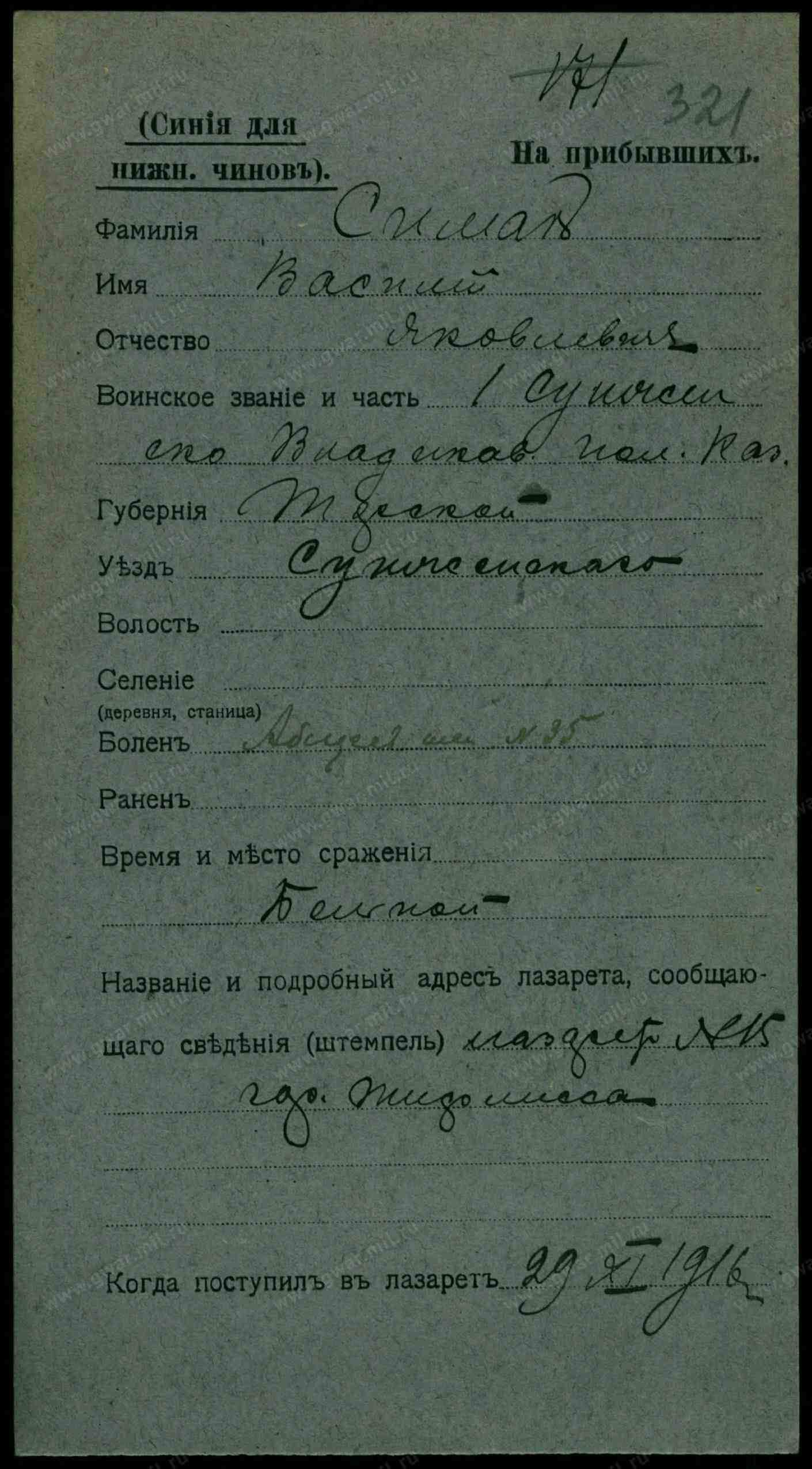 Восприемники: Казак 1-го С-Вл. Ген. Слепцова полка, 6-й сотни Александр Яковлев Симак и дочь крестьянина Саратовской губ., Вольского уезда, села Петропавловского Никиты Адрианова Мартынова - девица Елизавета Никитина Мартынова.