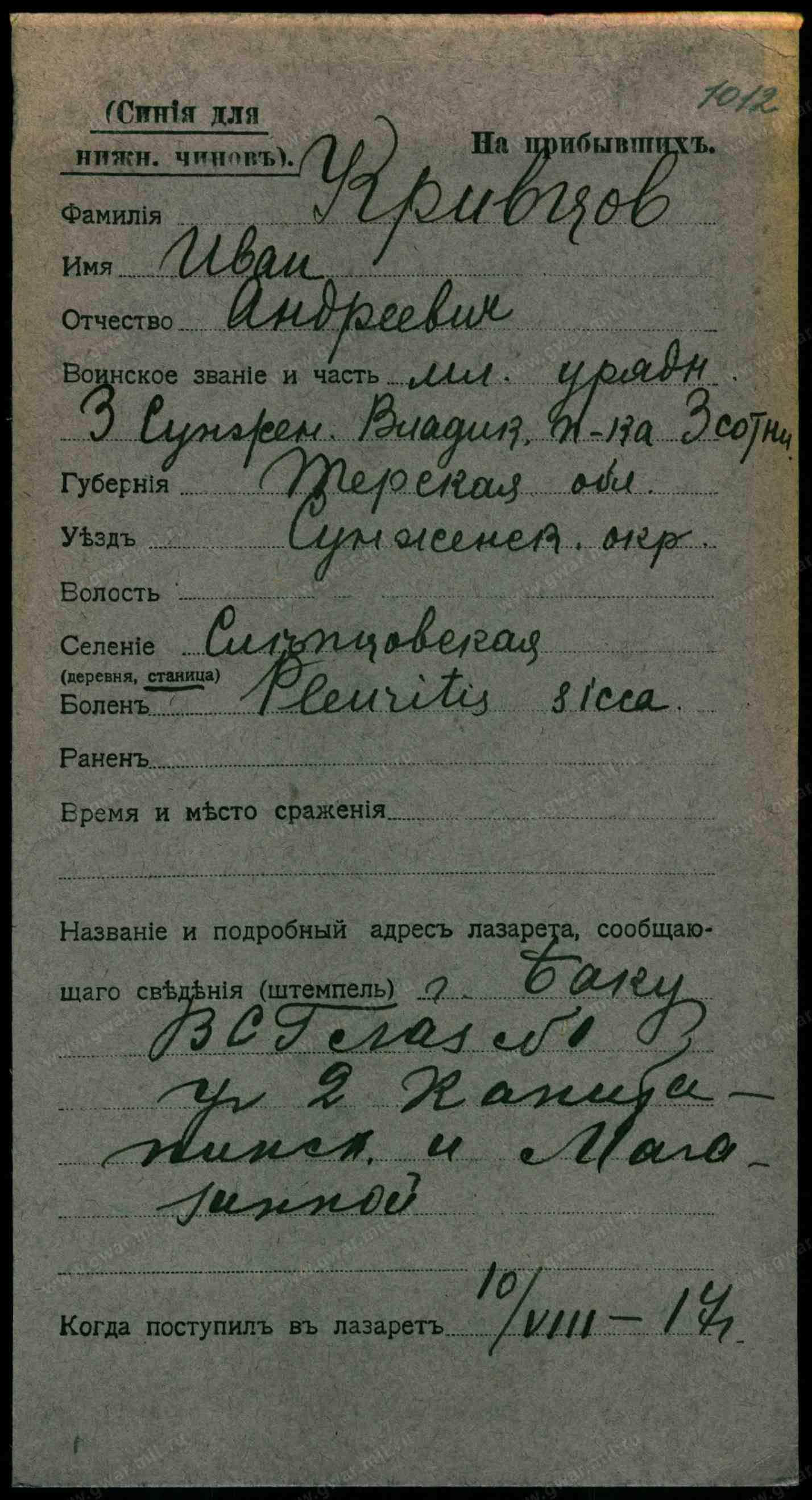 Список нижним чинам 1-го Сунженско-Владикавказского Генерала Слепцова полка ТКВ, подлежащих увольнению в войско на льготу в октябре месяце 1912г. (РГВИА ф.2306, оп.1, д.259 л.40-43об.)