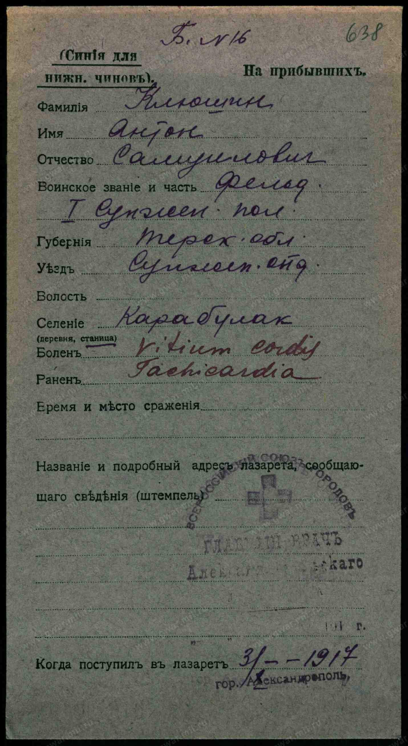 Тип документа Карточка на прибывших (нижние чины)