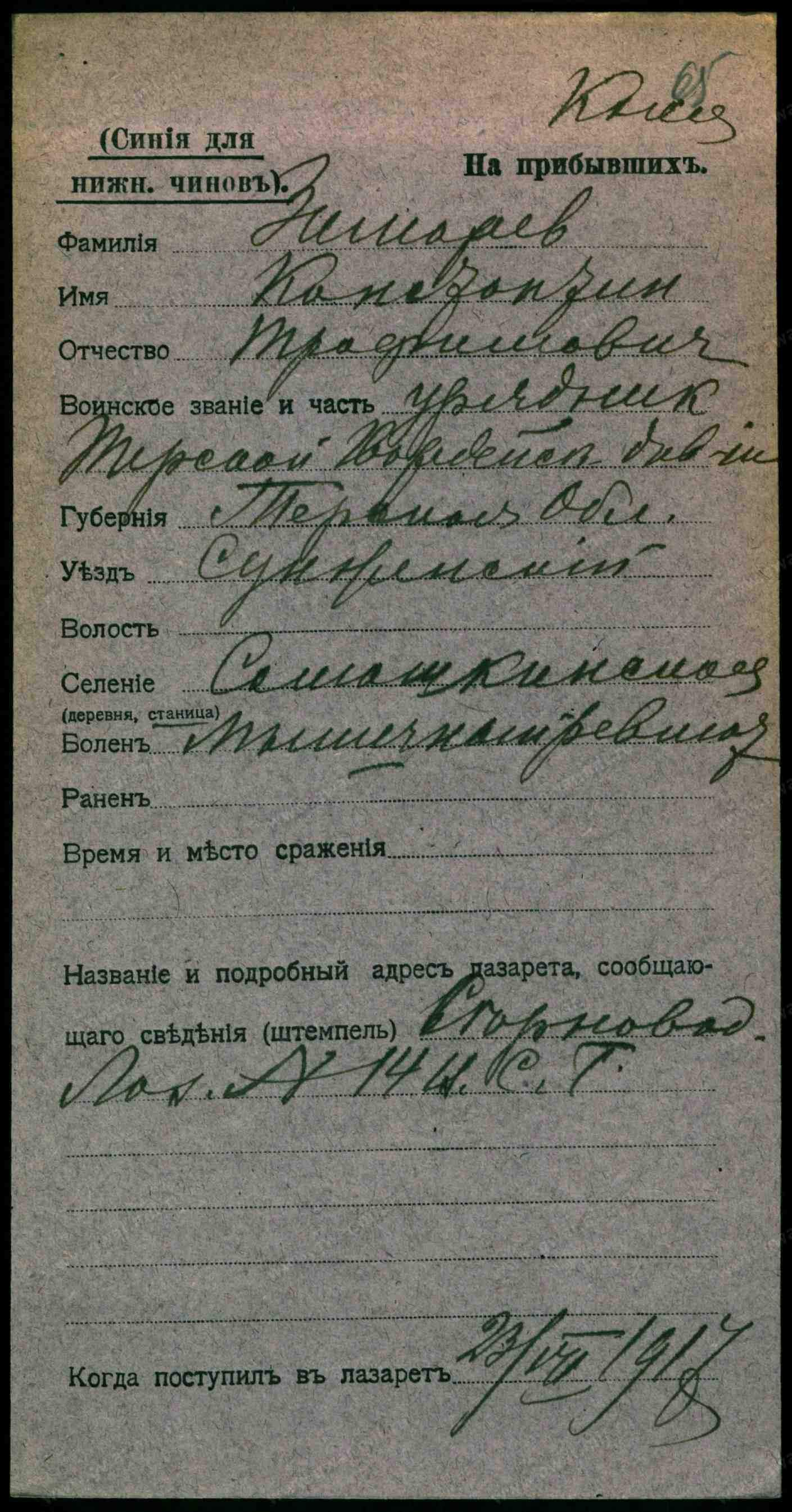 казак ЗИМАРЕВ Михаил Гаврилович (умер от ран), ст Самашкинская, женат