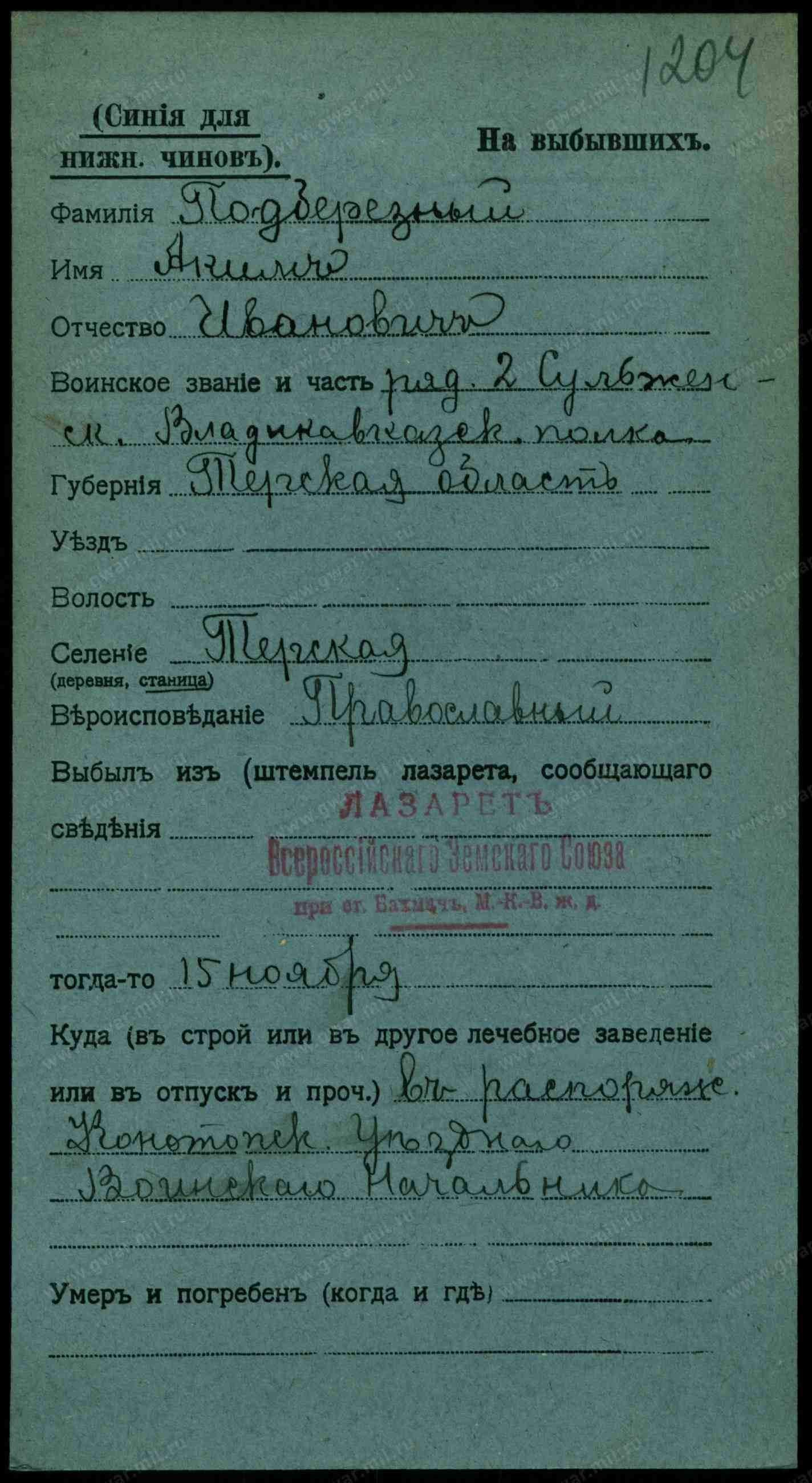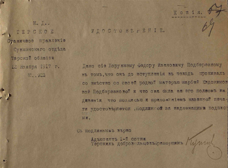 Родители: Урядникъ станицы Терской, Тер. Обл. Iоаннъ Iоанновъ Подберезный