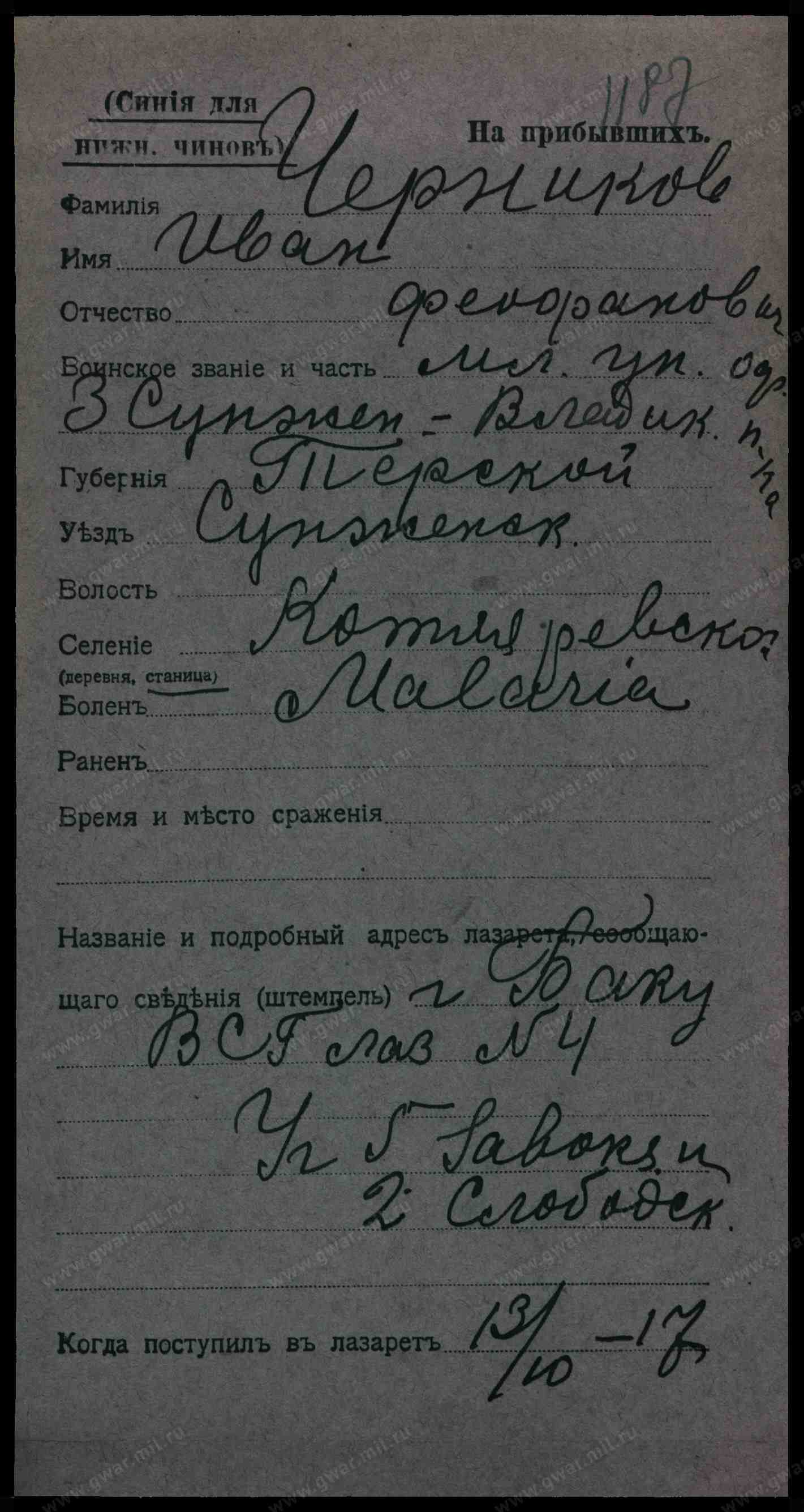 Воинская часть: 3-й Сунженско-Владикавказский полк Терского казачьего войска.