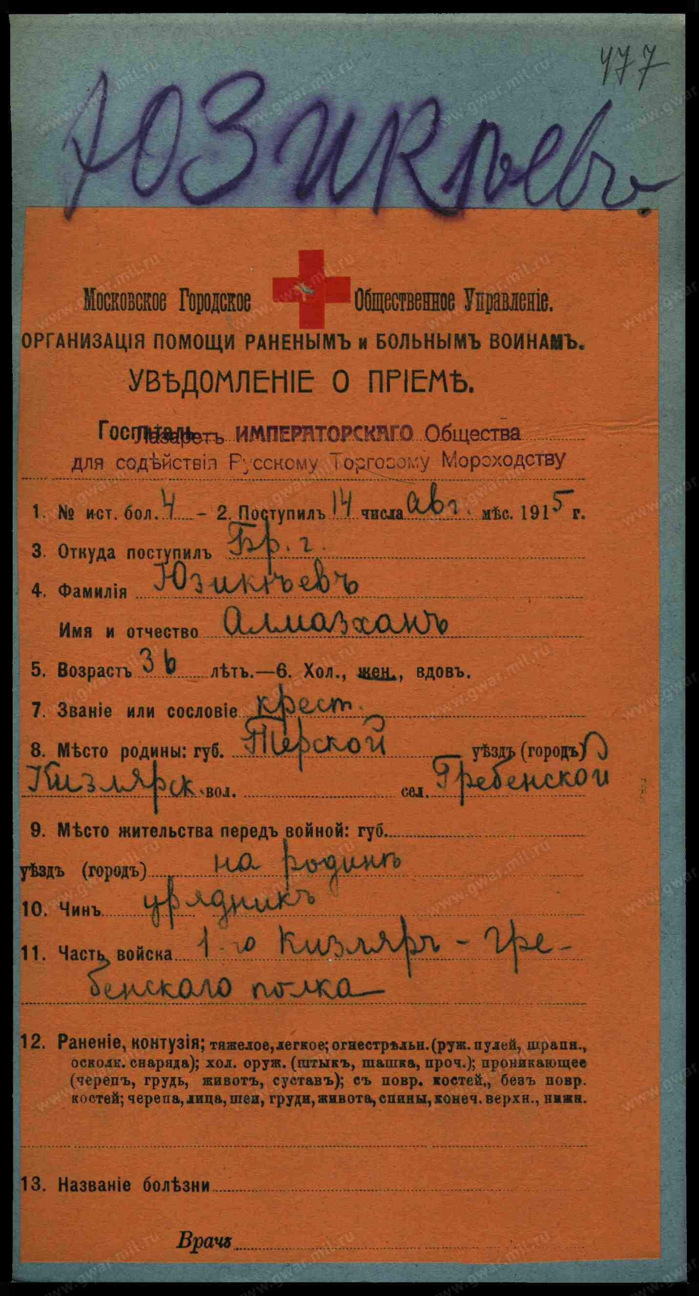 Место рождения Терская обл., Кизлярский отдел, Гребенская станица