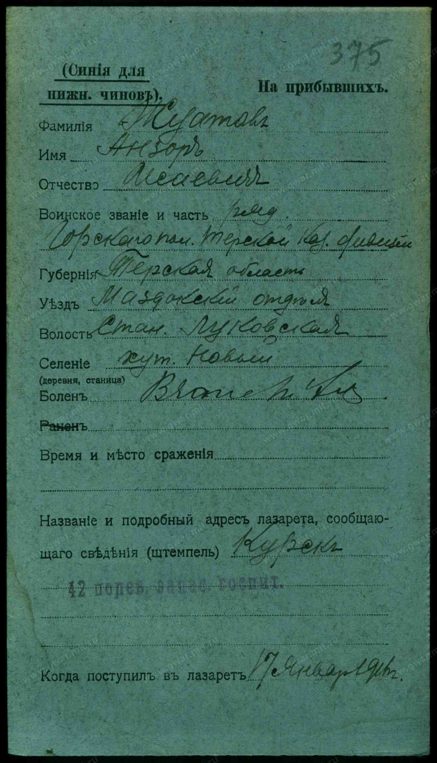 Место рождения Терская обл., Моздокский отдел, Луковская станица, х. Новый