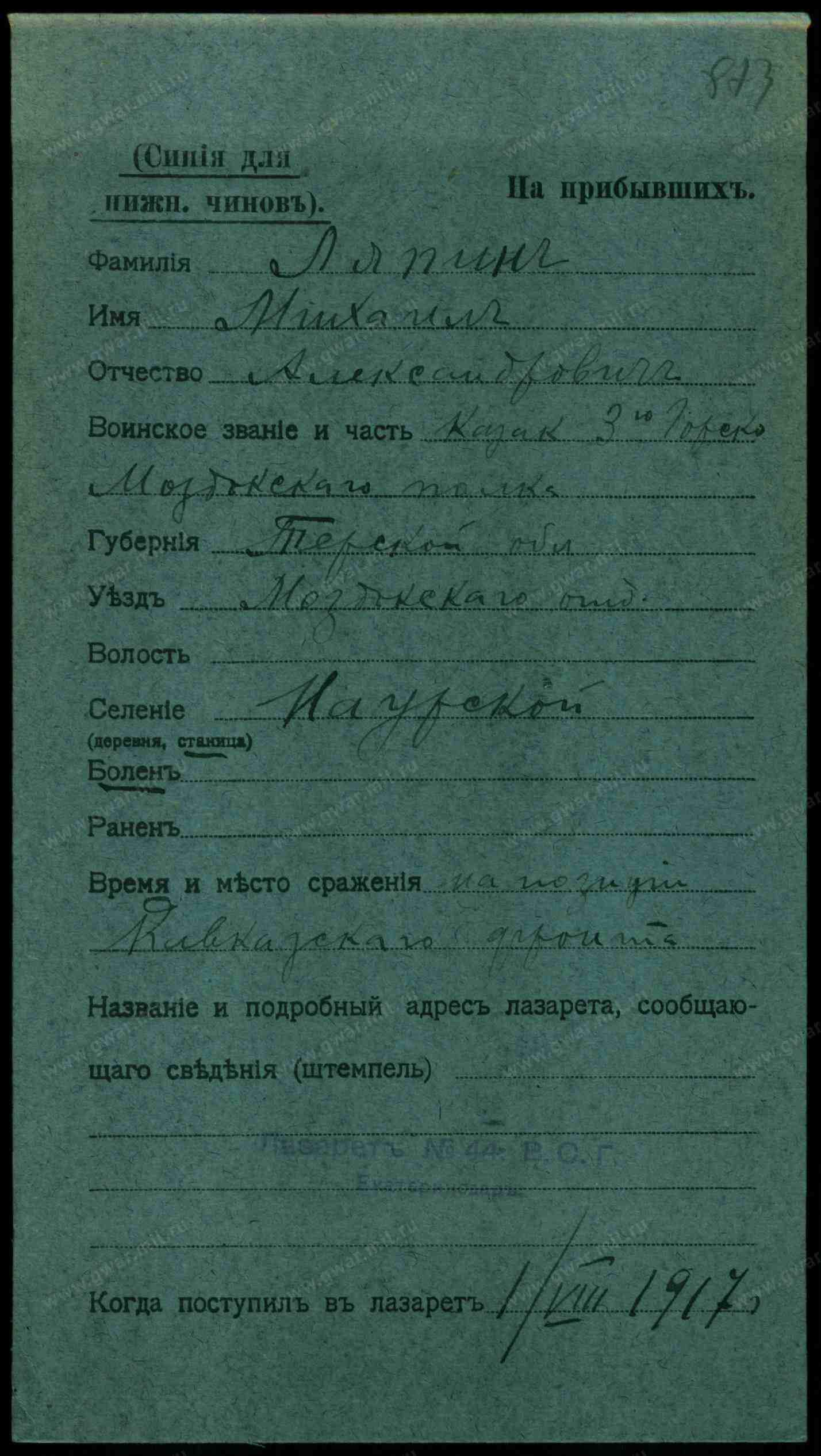 Тип документа Карточка на прибывших (нижние чины)
