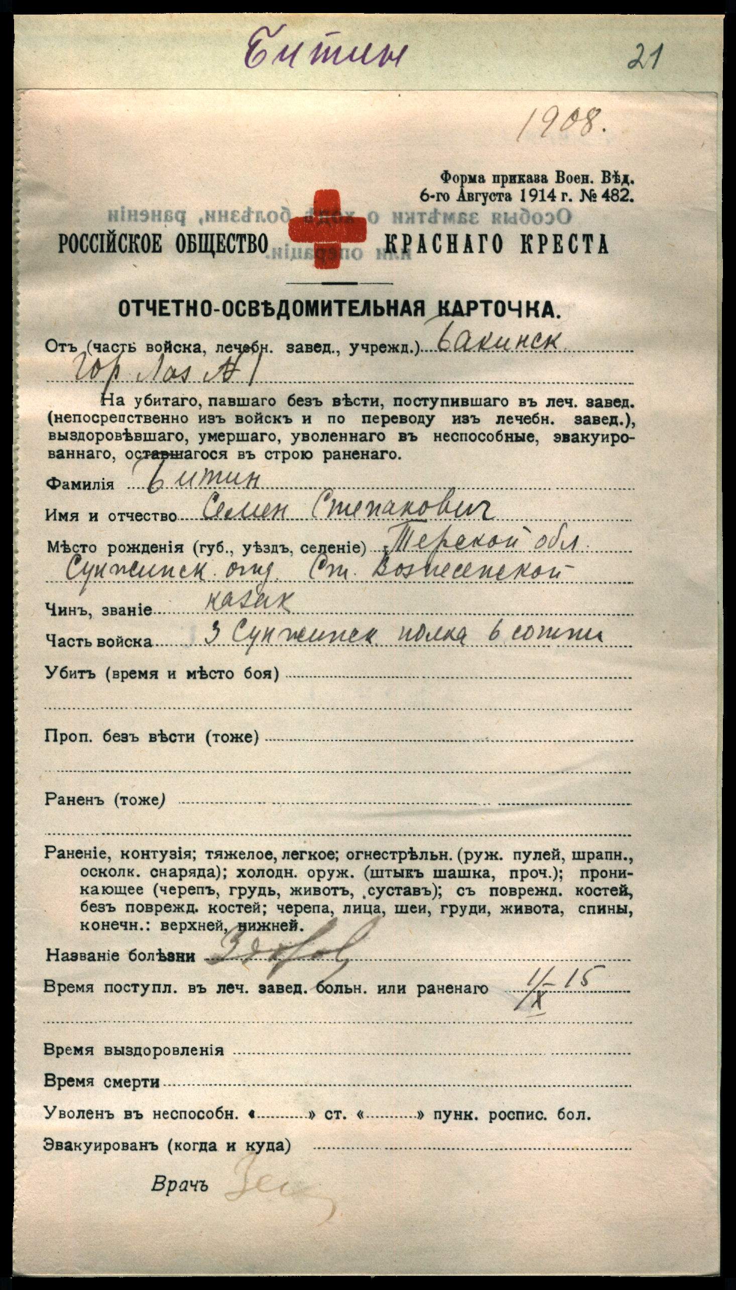Состоящий на службе при Оренбургском казачьем училище казак, Терского казачьего войска Старо-Гладковской станицы, Никифор Сергеевич Мартынов; старообрядец Австрийского толка, холост, 24 лет и Дочь крестьянина Каменец-Подольской губ., Ушицкого уезда, Рахновской волости, деревни Спасовка девица Евгения Феодоровна Яськова, православного вероисповедания, 17 лет.