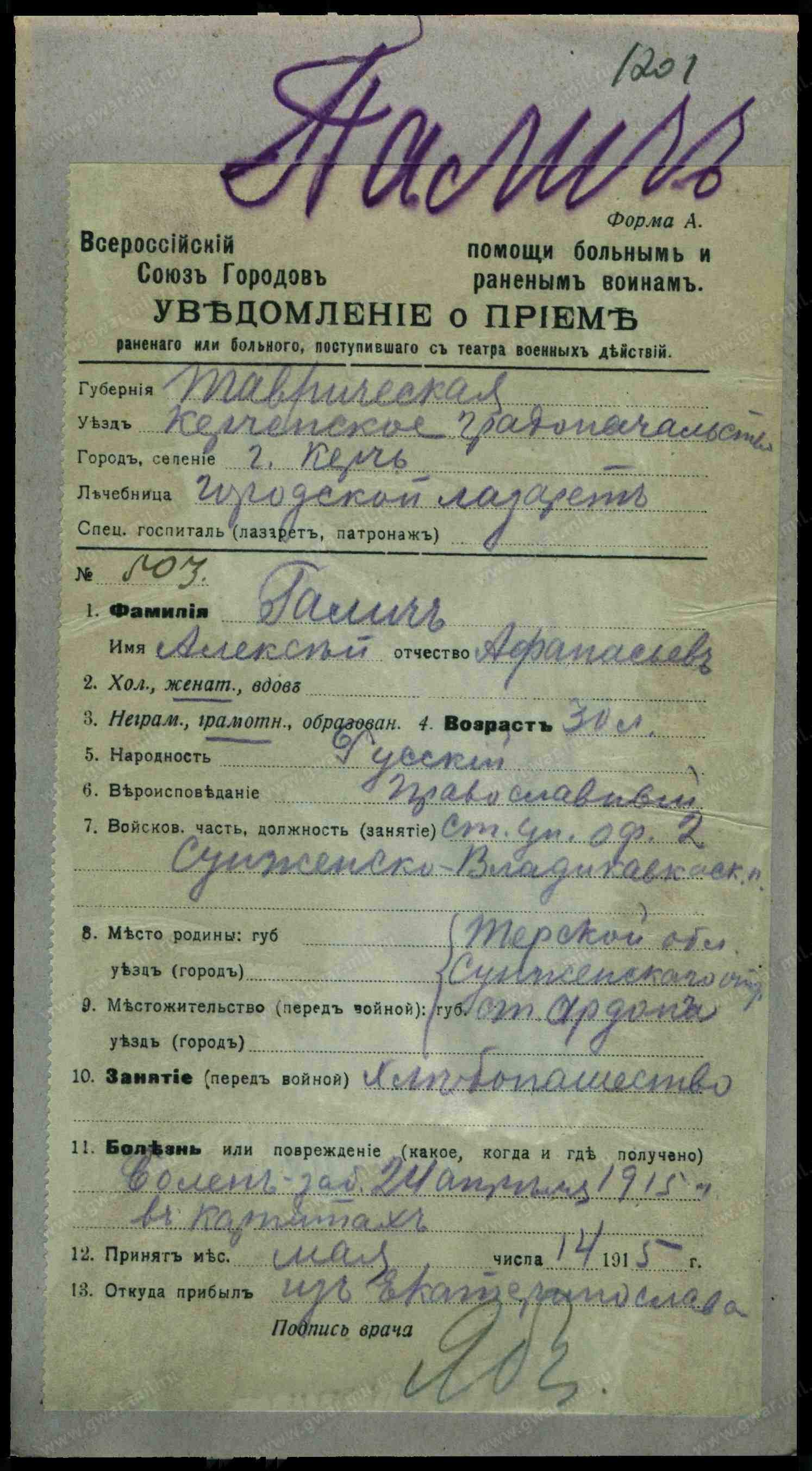 Место рождения. Губерния Терская обл.
