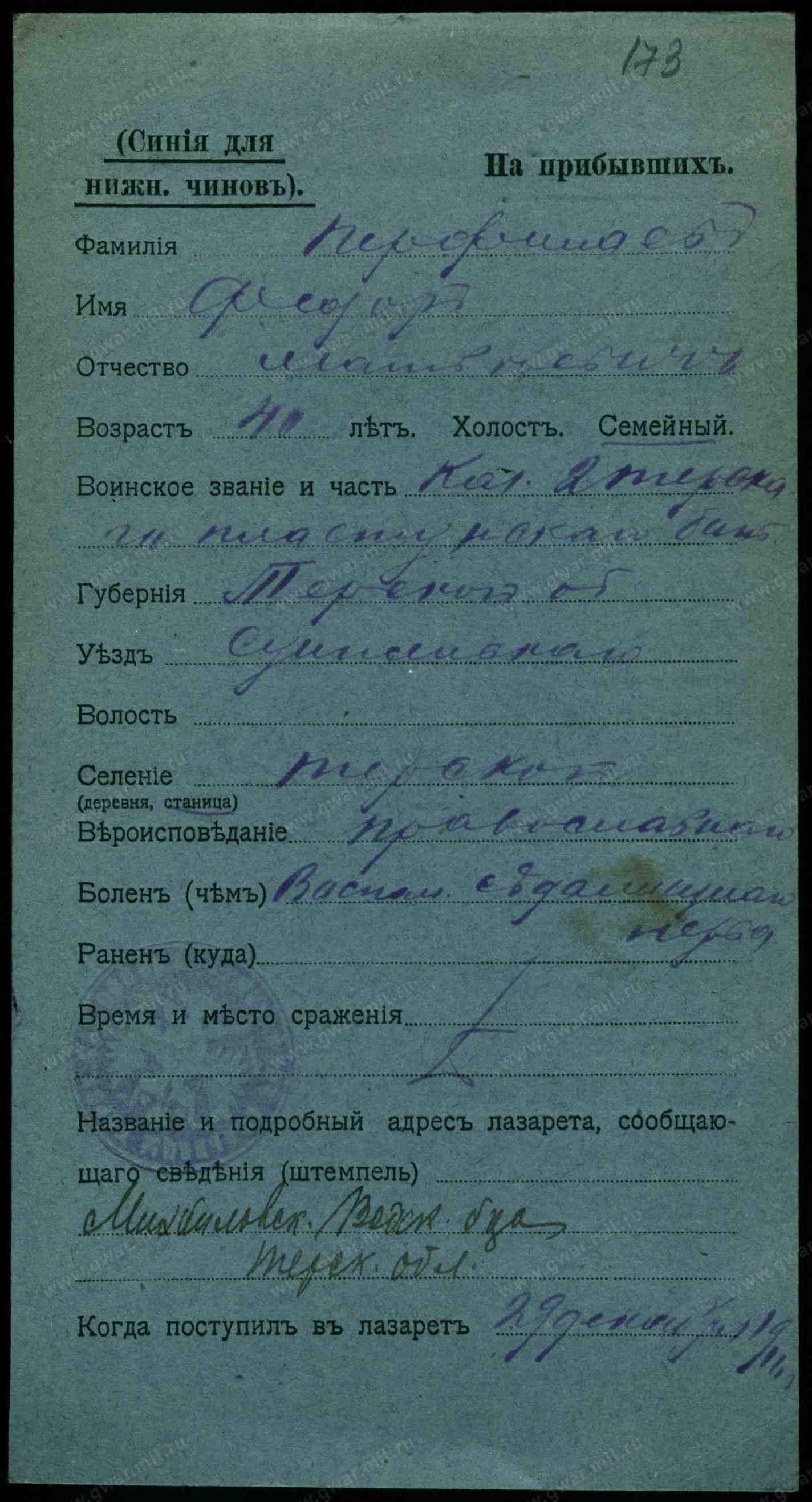 Перфильев Иван Терская обл. Терская ст. Пособие 1911