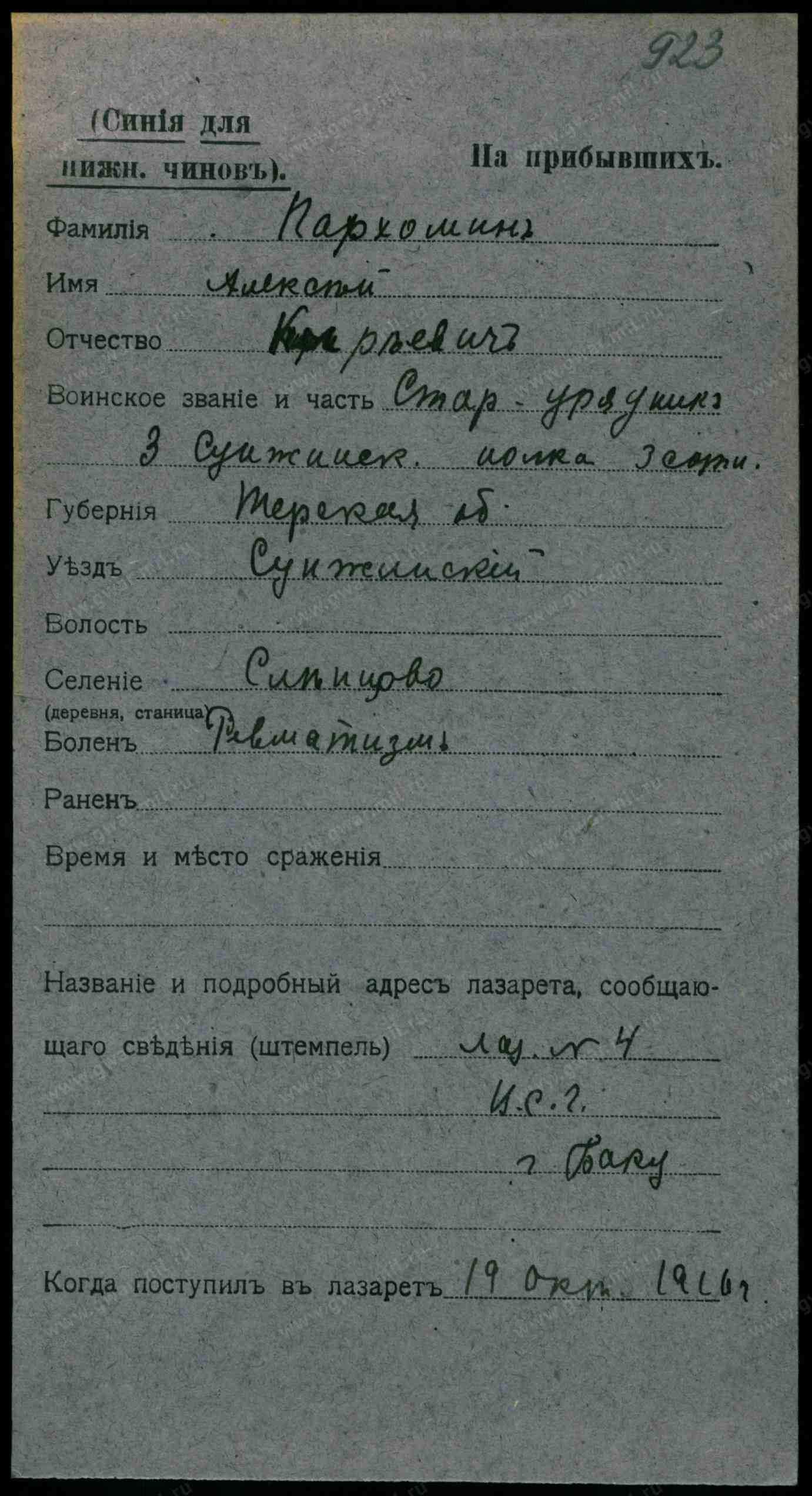 Сержант тех. службы, __.__.1895 Грозненская обл., Сунженский р-н, ст. Ордженикизев.