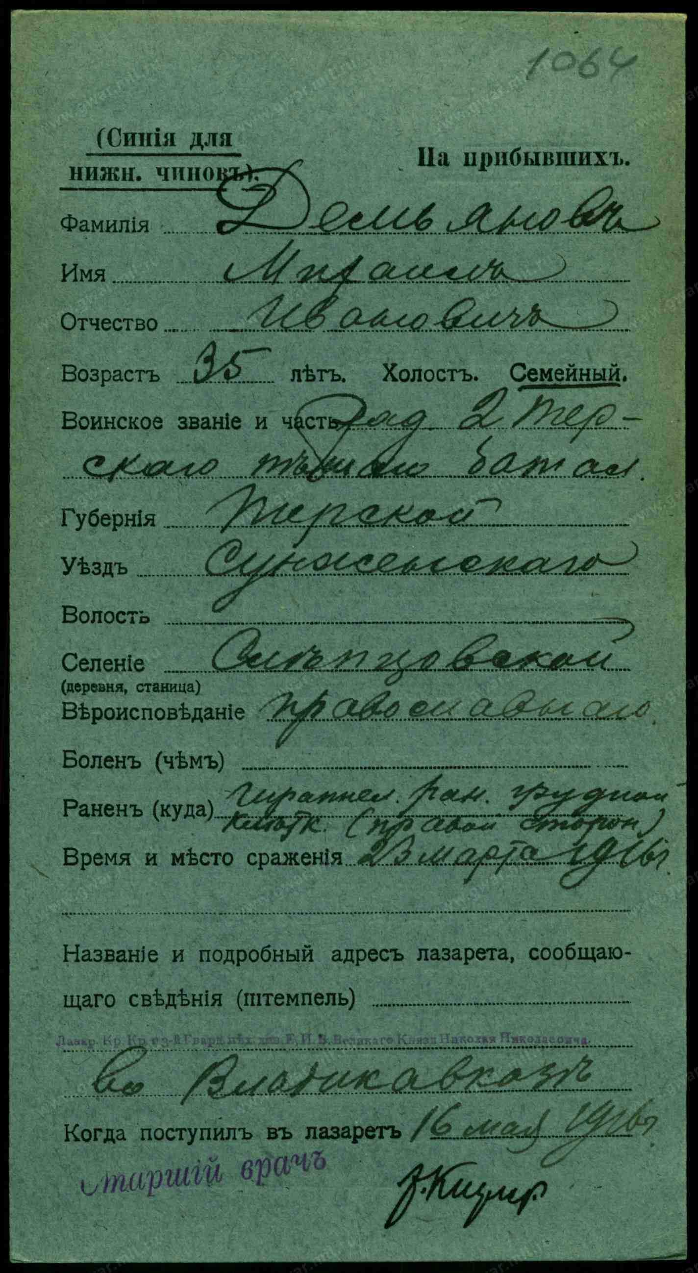Рядовой, __.__.1906 Чечено-Ингушская АССР, Сунженский р-н, ст-ца Орджоникидзевская. Донесение о потерях