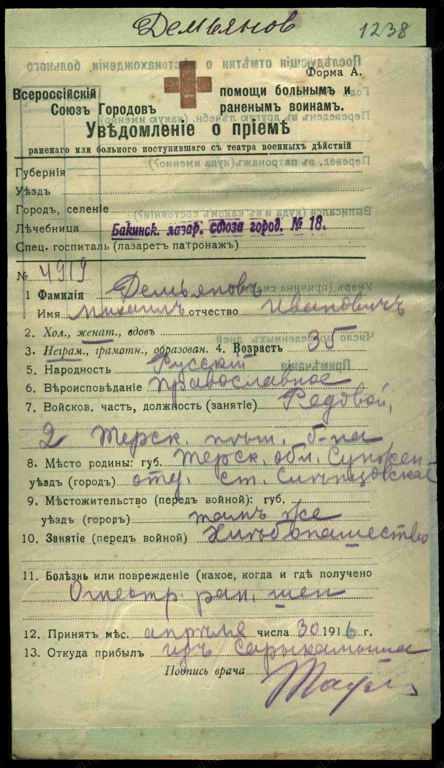 Отец: Демьянов Матвей Степанович ст. Орджоникидзевская