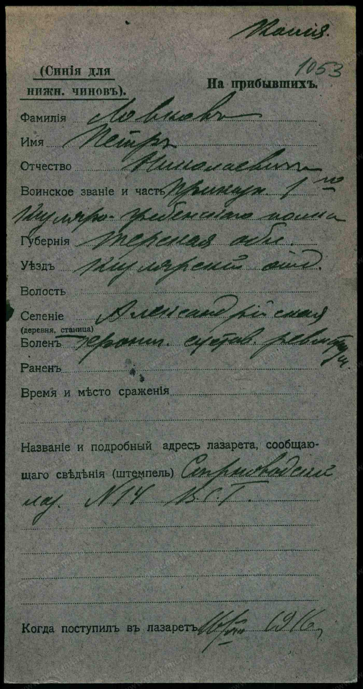 Тип документа Карточка на прибывших (нижние чины)