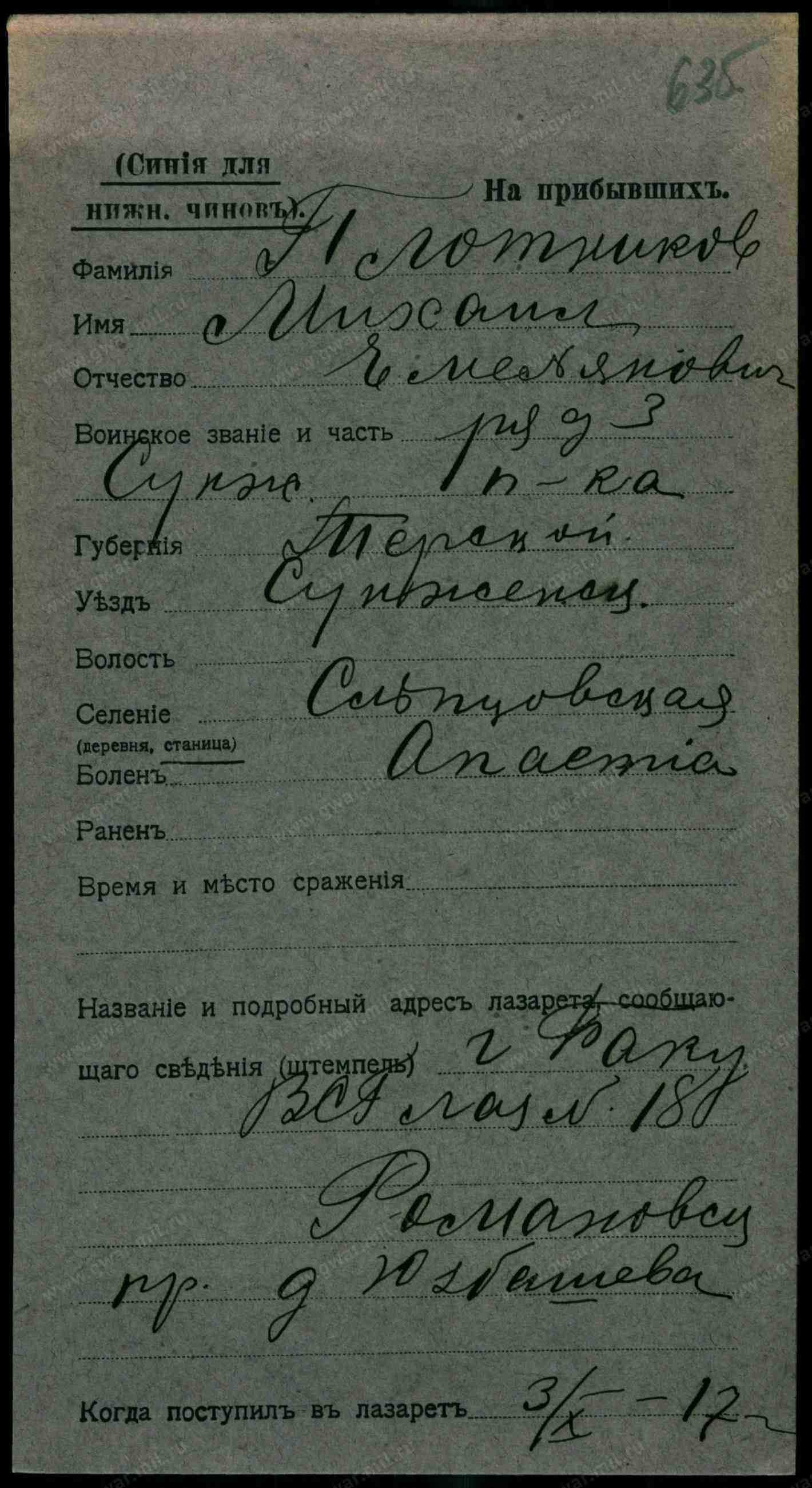Тип документа Карточка на прибывших (нижние чины)
