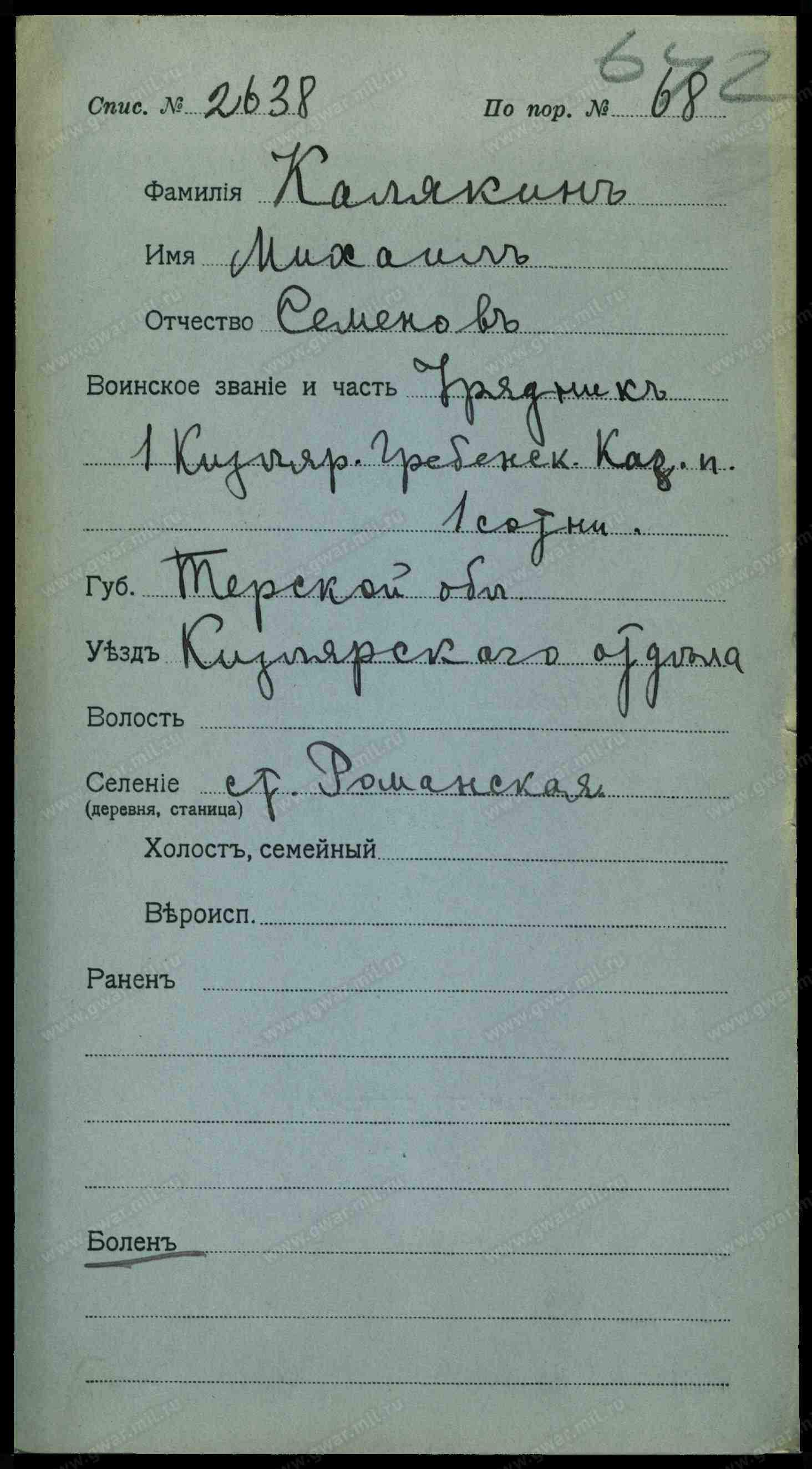 123755 Калякин, Семен Никандров. Каз. ст. Закан-Юрт, Кизляр. отд., 45 л., - . С. М. С. 24 Авг. 909, 169 М., тюр. 5 м. Исп. … Сент. 909.