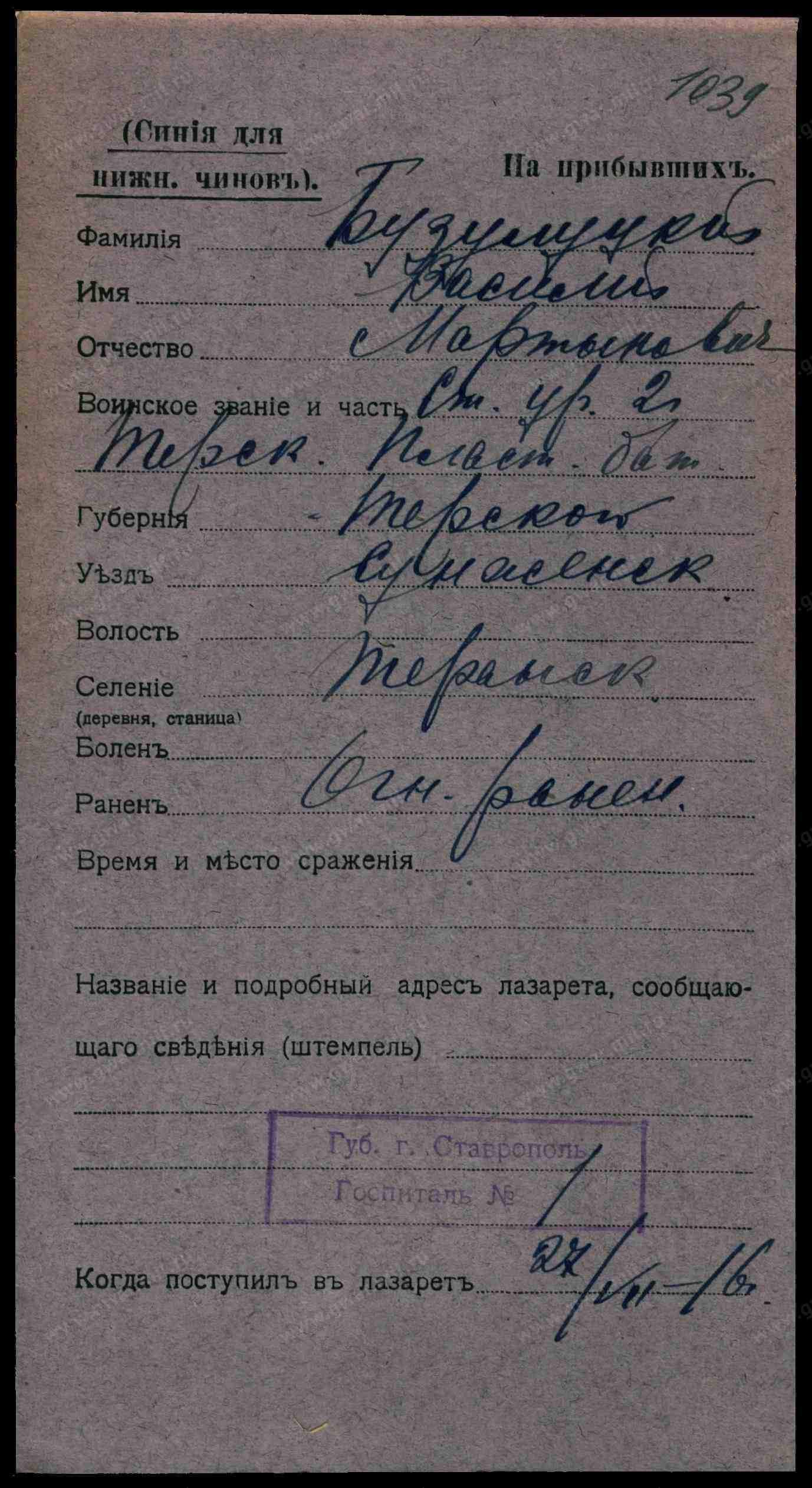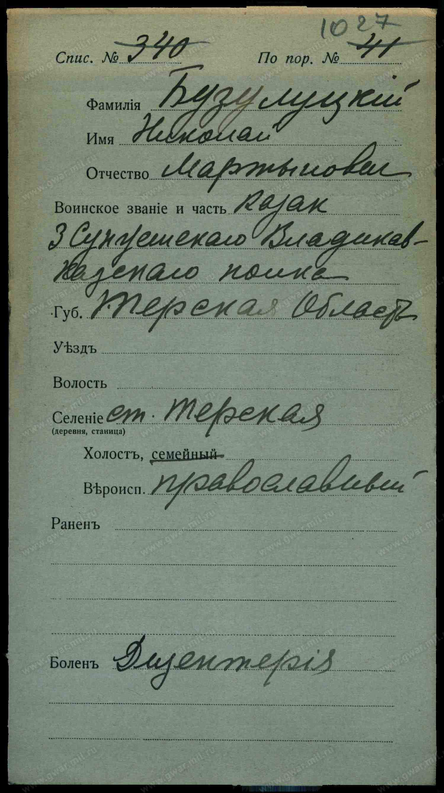 Место рождения. Губерния Терская обл.