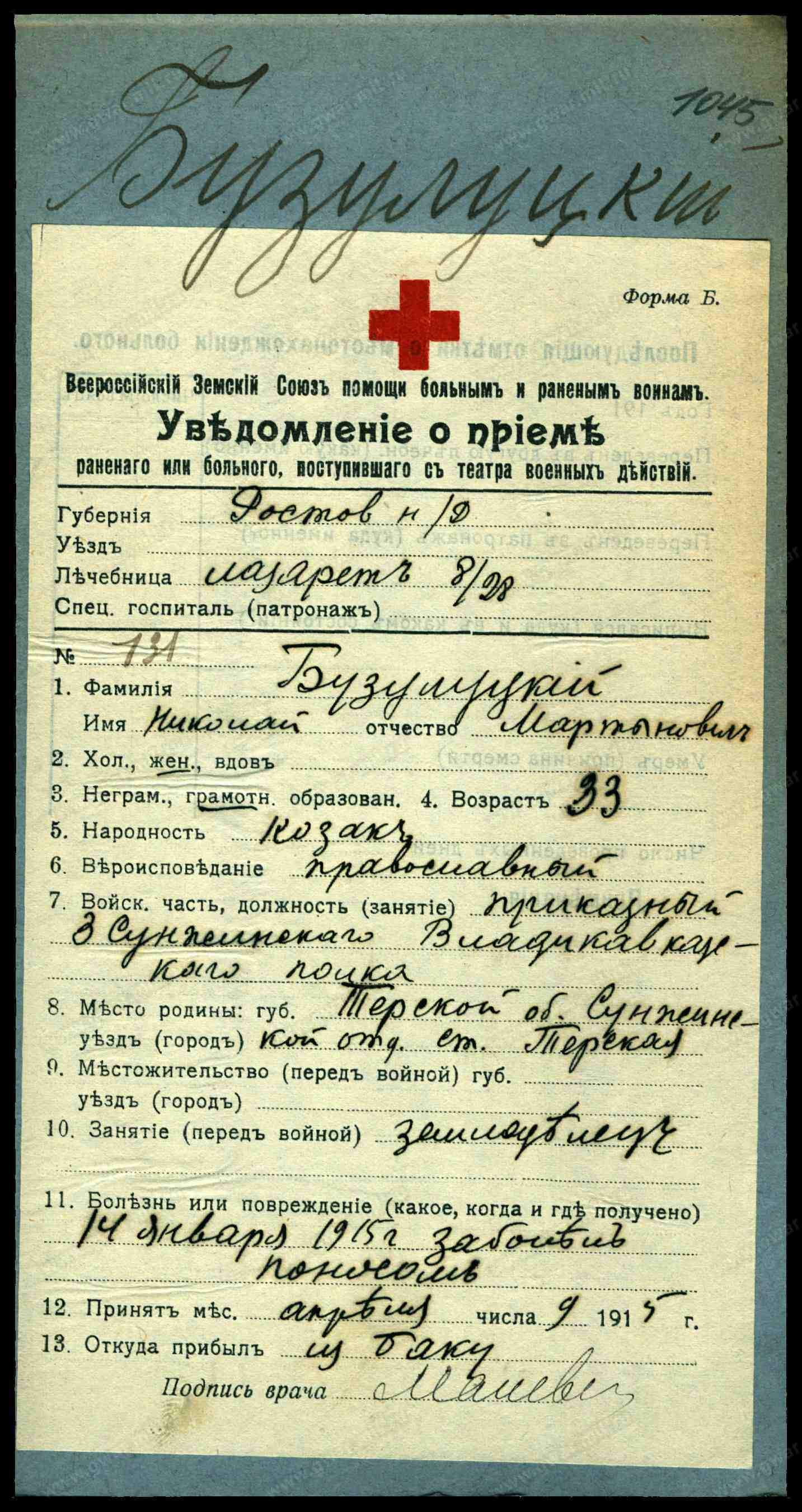 Место рождения Терская обл., Терская станица