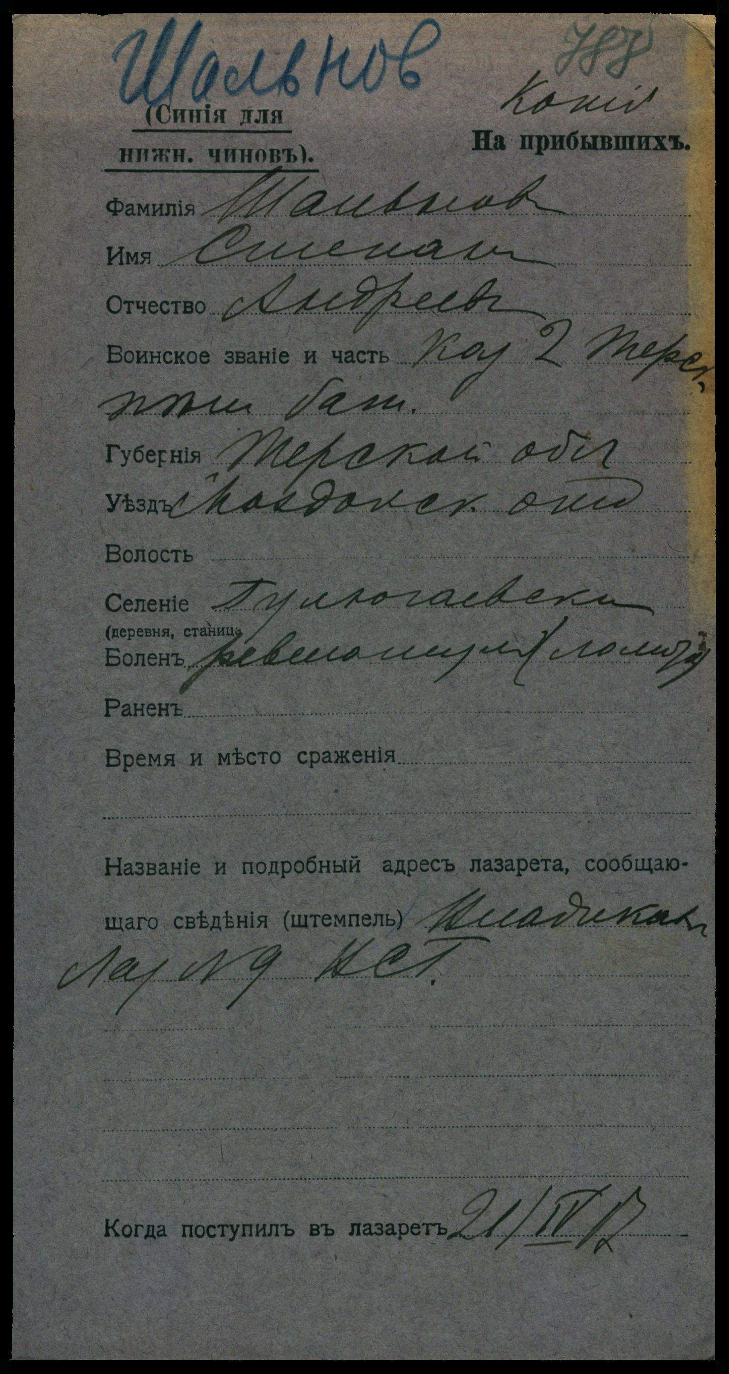 Тип документа Карточка на прибывших (нижние чины)