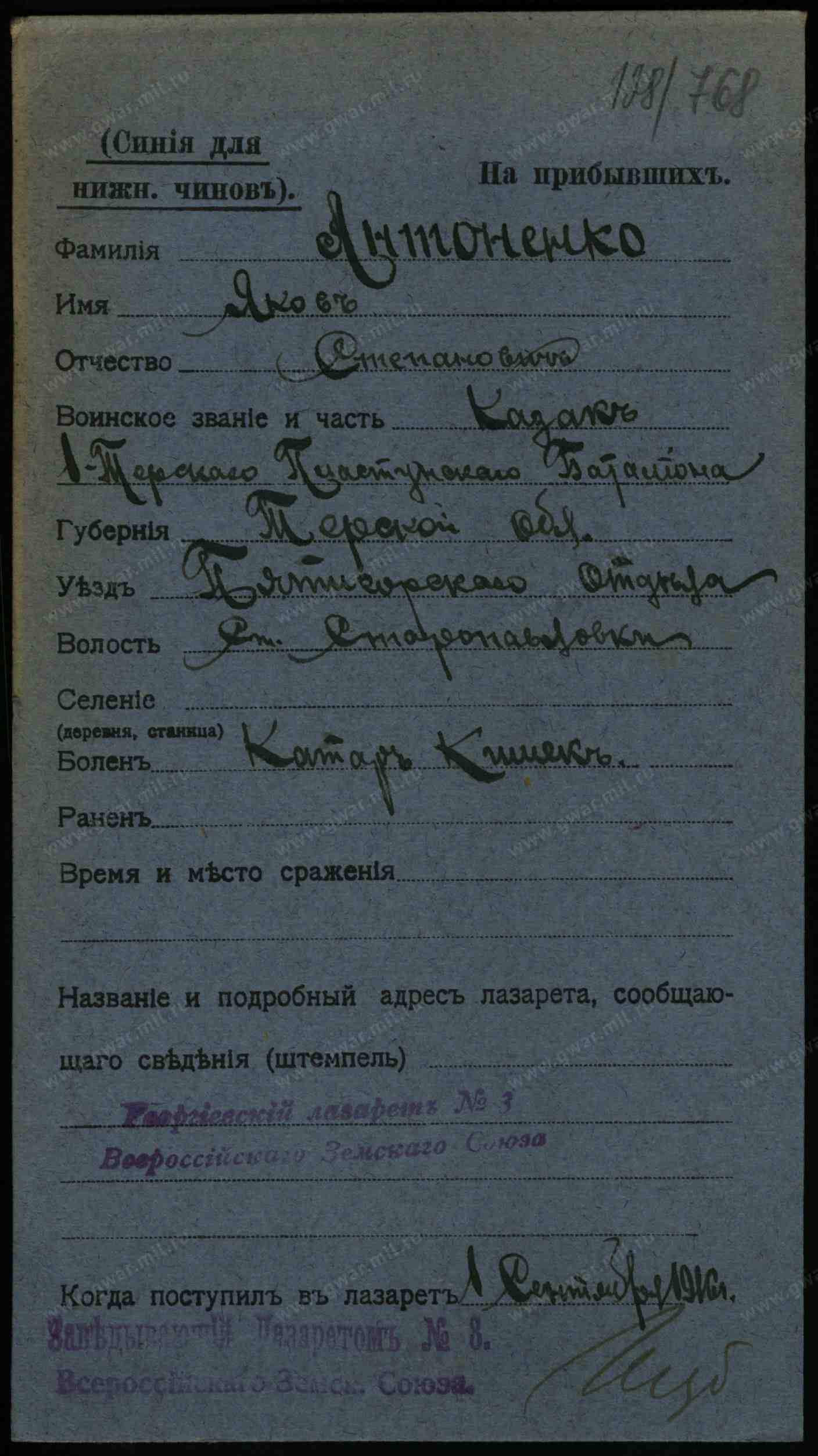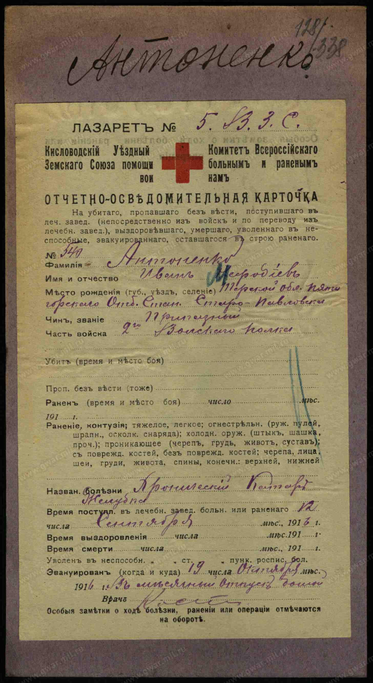 Место рождения Терская обл., Пятигорский отдел, ст. Старопавловка