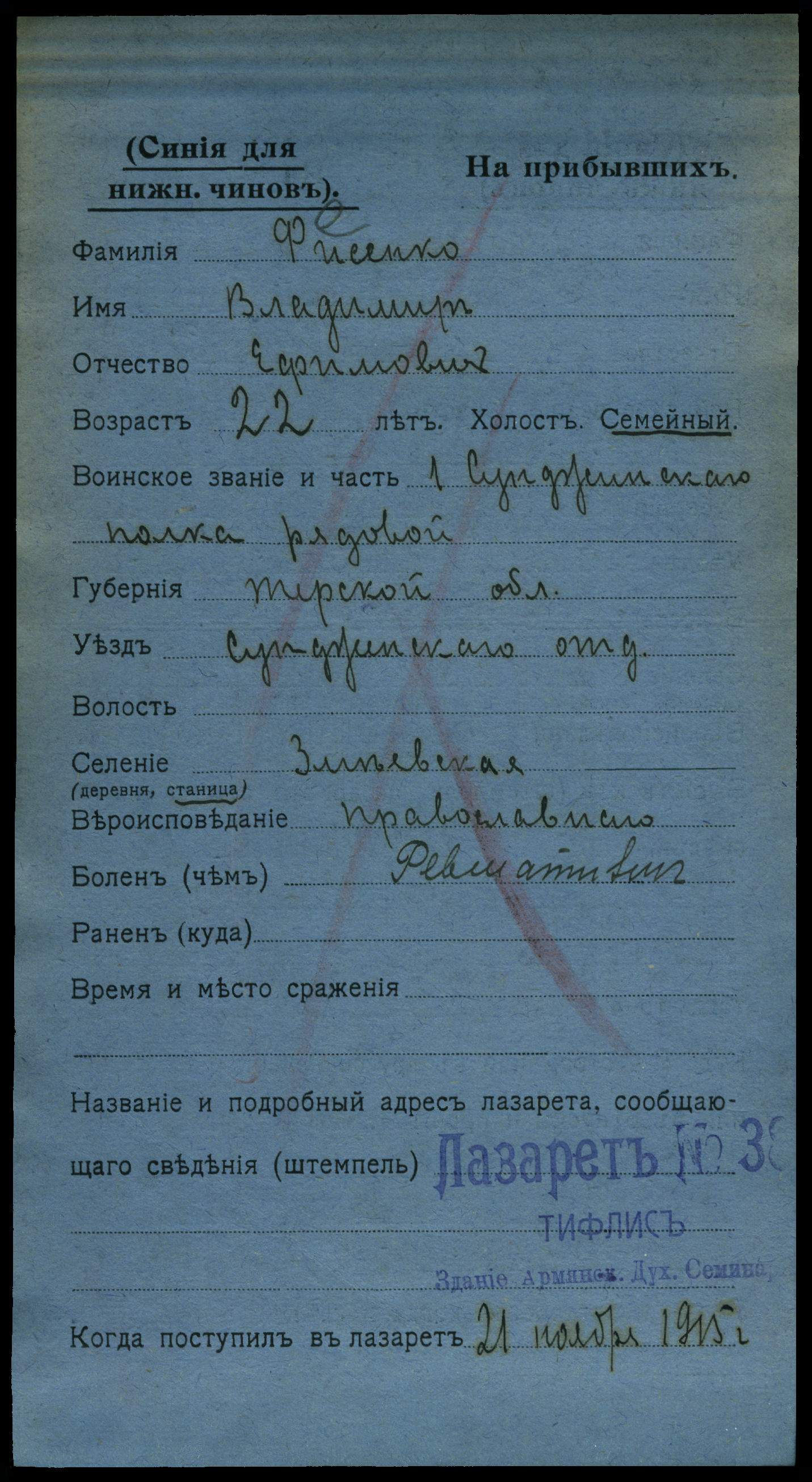 59410 Фисенко, Степан Ефимов. К. Сунжен. отд. ст. Змейской, 19 л.; — Тифлисск. С. П., 134, 135, 140 и 2 ч. 1484 У., тюр. 8 м. Исп. 25 Июля 906.