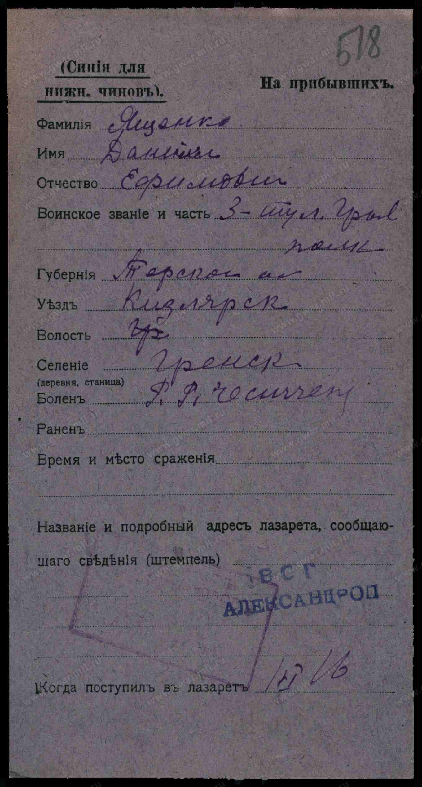 Тип документа Карточка на прибывших (нижние чины)