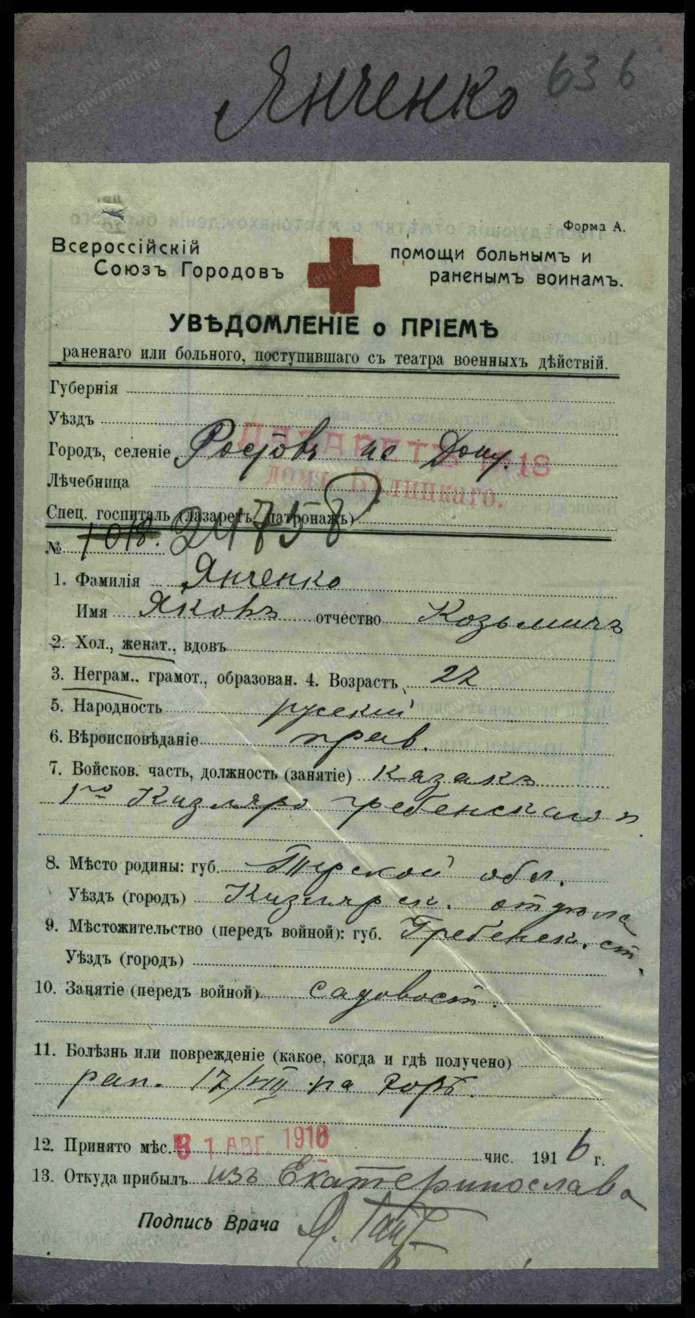 Дата выбытия 17.08.1916