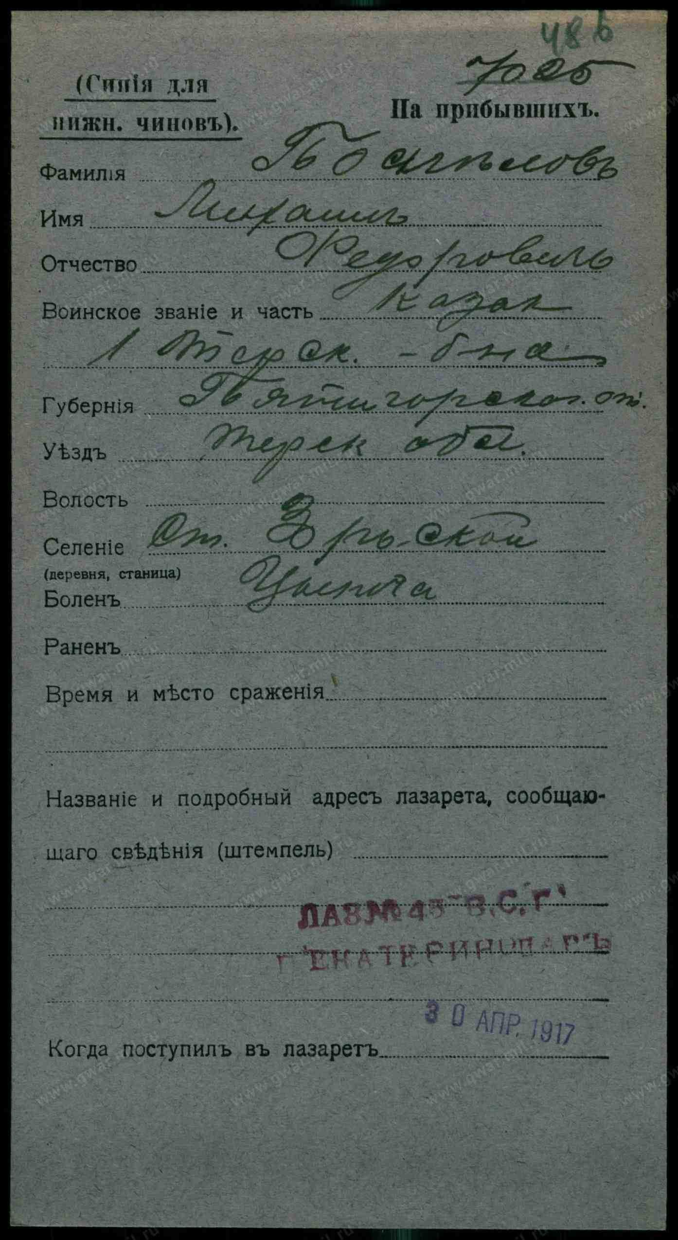 Место рождения. Губерния Терская обл.