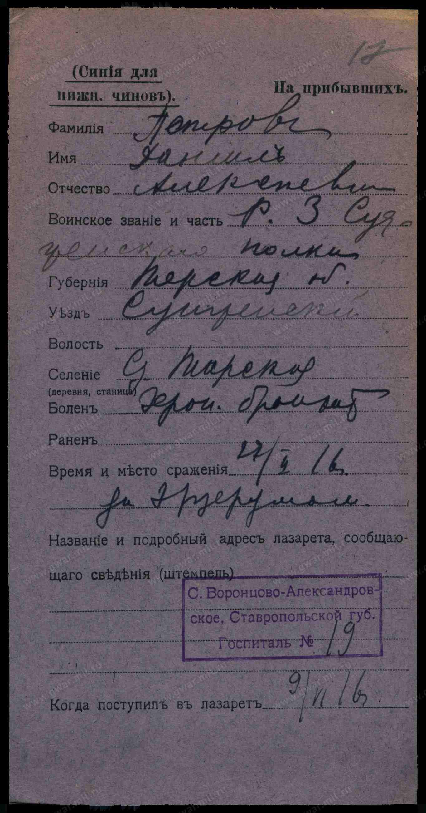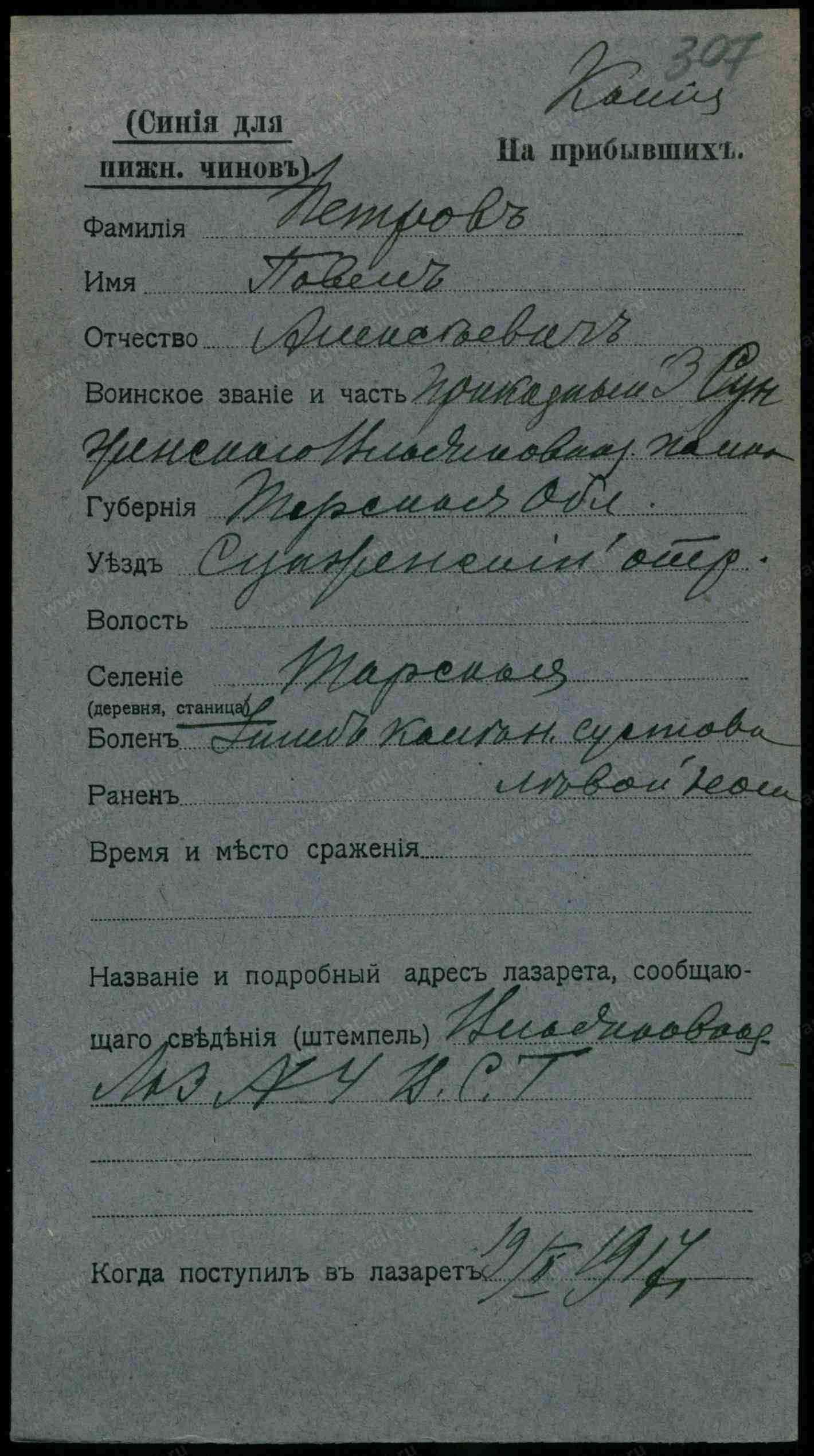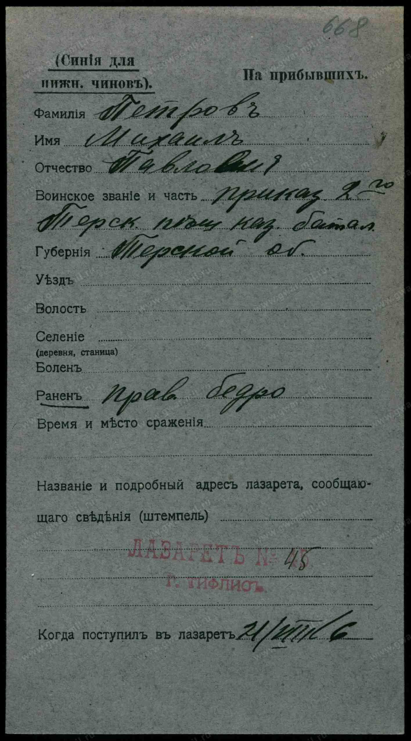 Тип документа Карточка на прибывших (нижние чины)