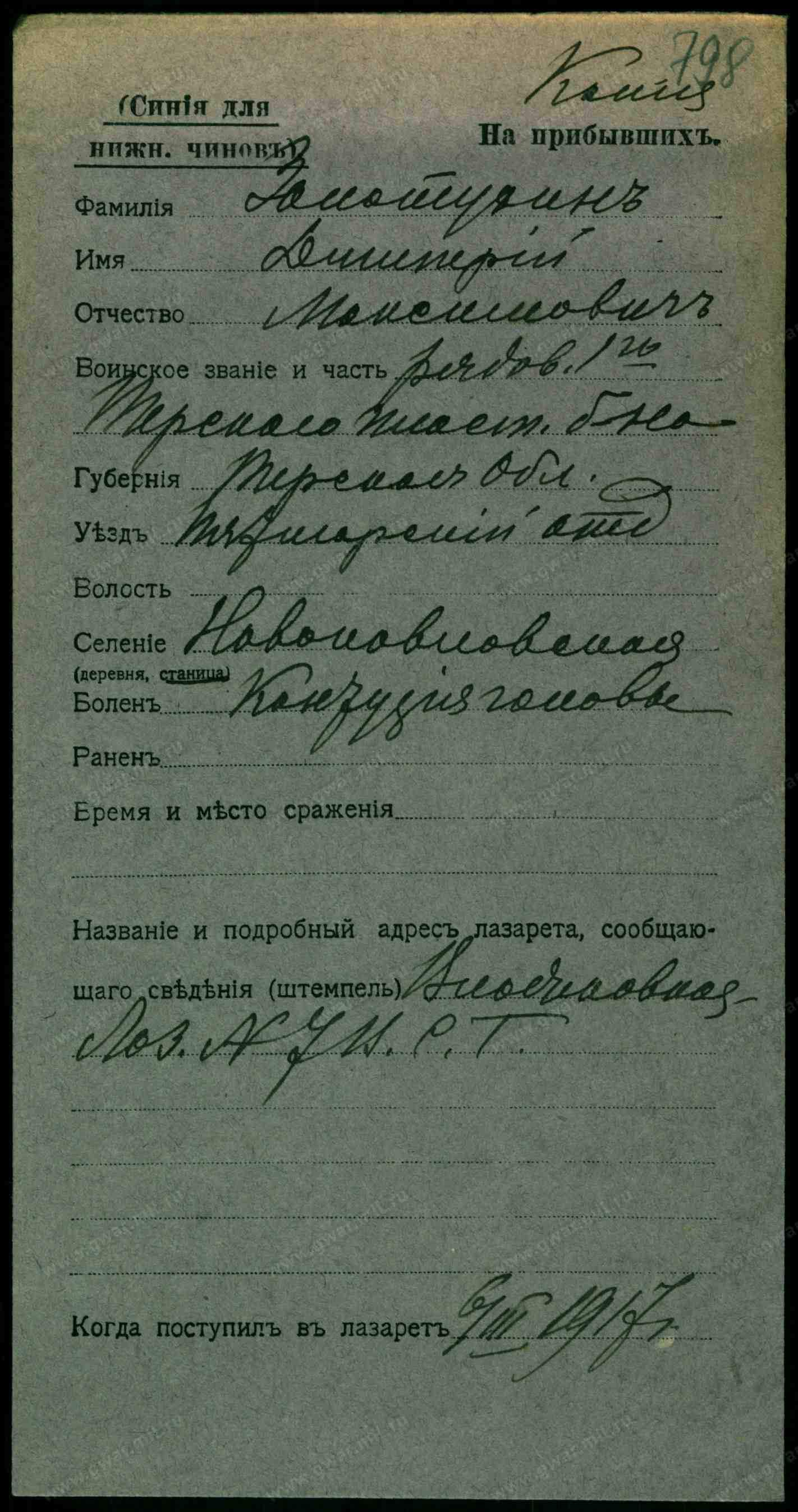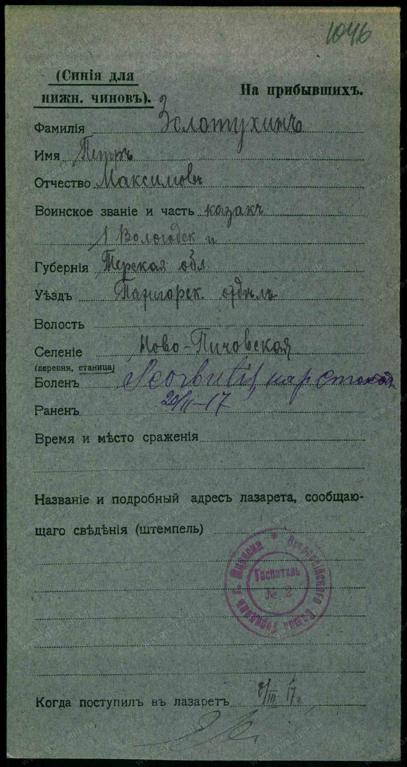 Место рождения Терская обл., Пятигорский отдел, стнц. Ново-Пичовская