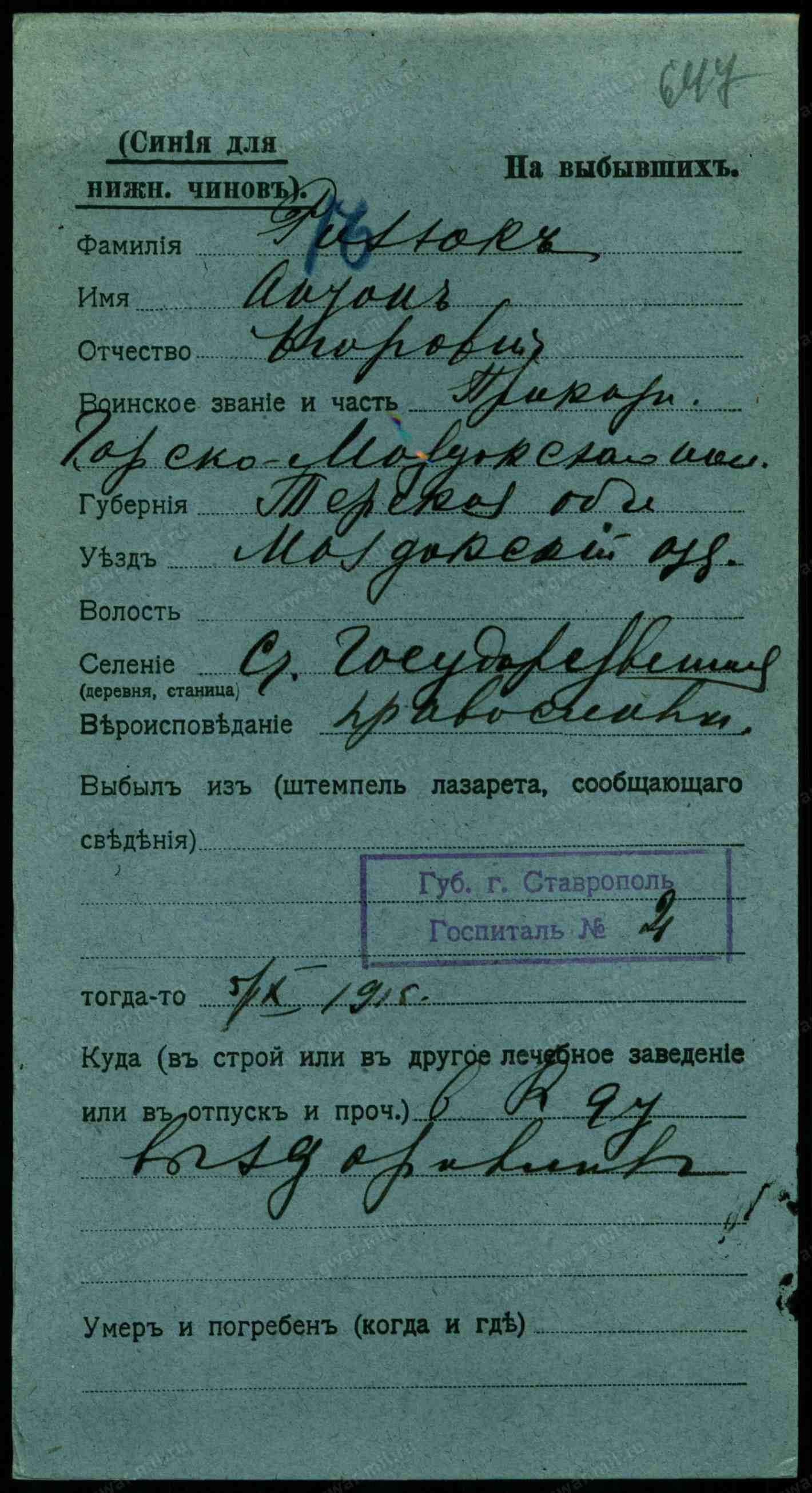 9139 Резюков, Яков Егоров, 23 л. Каз. ст. Государственной, Моздокск. отд.; — Пятигорск. С. М. С., 30 Апр. 912 (д. №22/911), 1 ч. 177 М. и Выс. маниф. 904 г., тюр. 2 м. Исп. 15 Сент. 912.