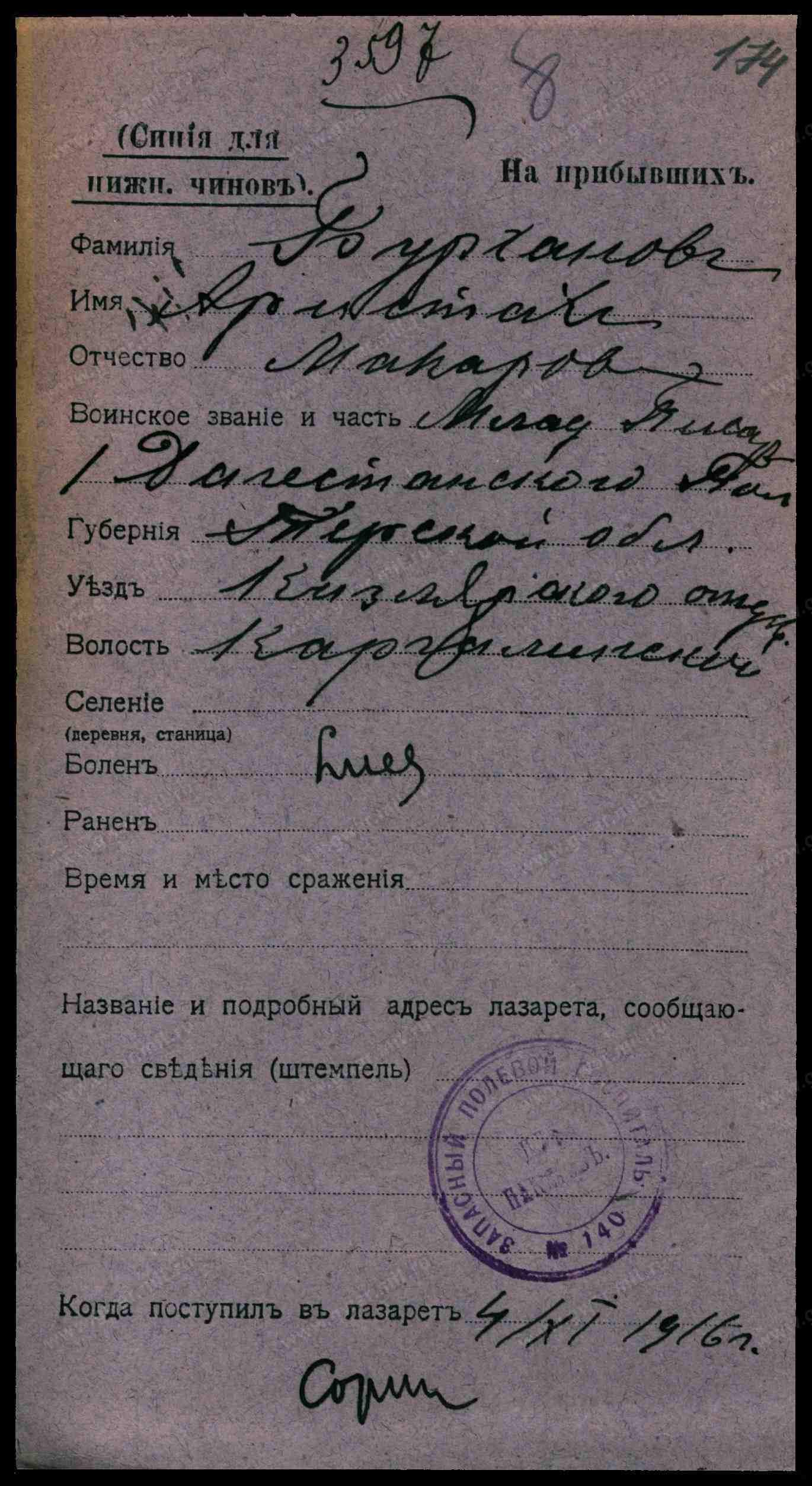 63361 Бурханов, Пимен Гуриев, 17 л. Каз. ст. Каргалинской, Кизлярск. отд.; — Владикавказск. О. С., 1 Мая 913 (Тифлисск. С. П. 23 Окт. 913) (д. №151/913), 140, 1 ч. 1653, 1 ч. 1654/2 У. и Выс. Ук. 913 г., тюр. 2 м. и 20 дн. Исп. 15 Янв. 914.