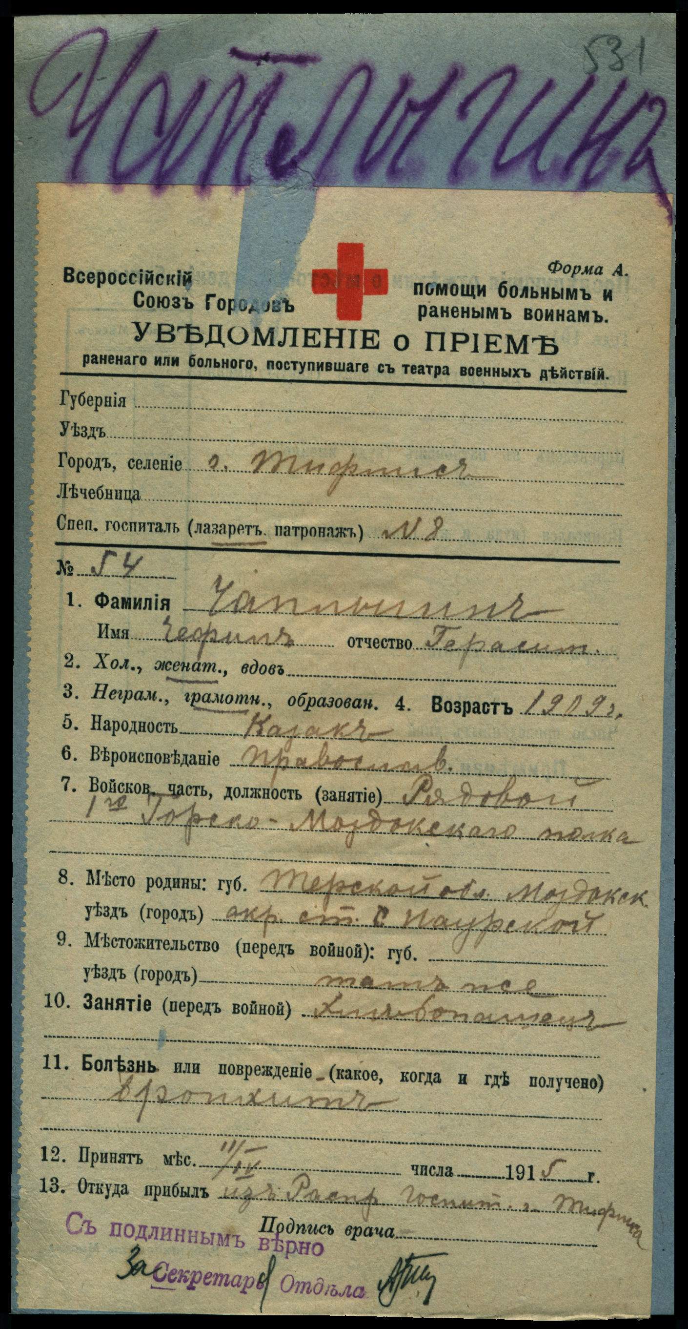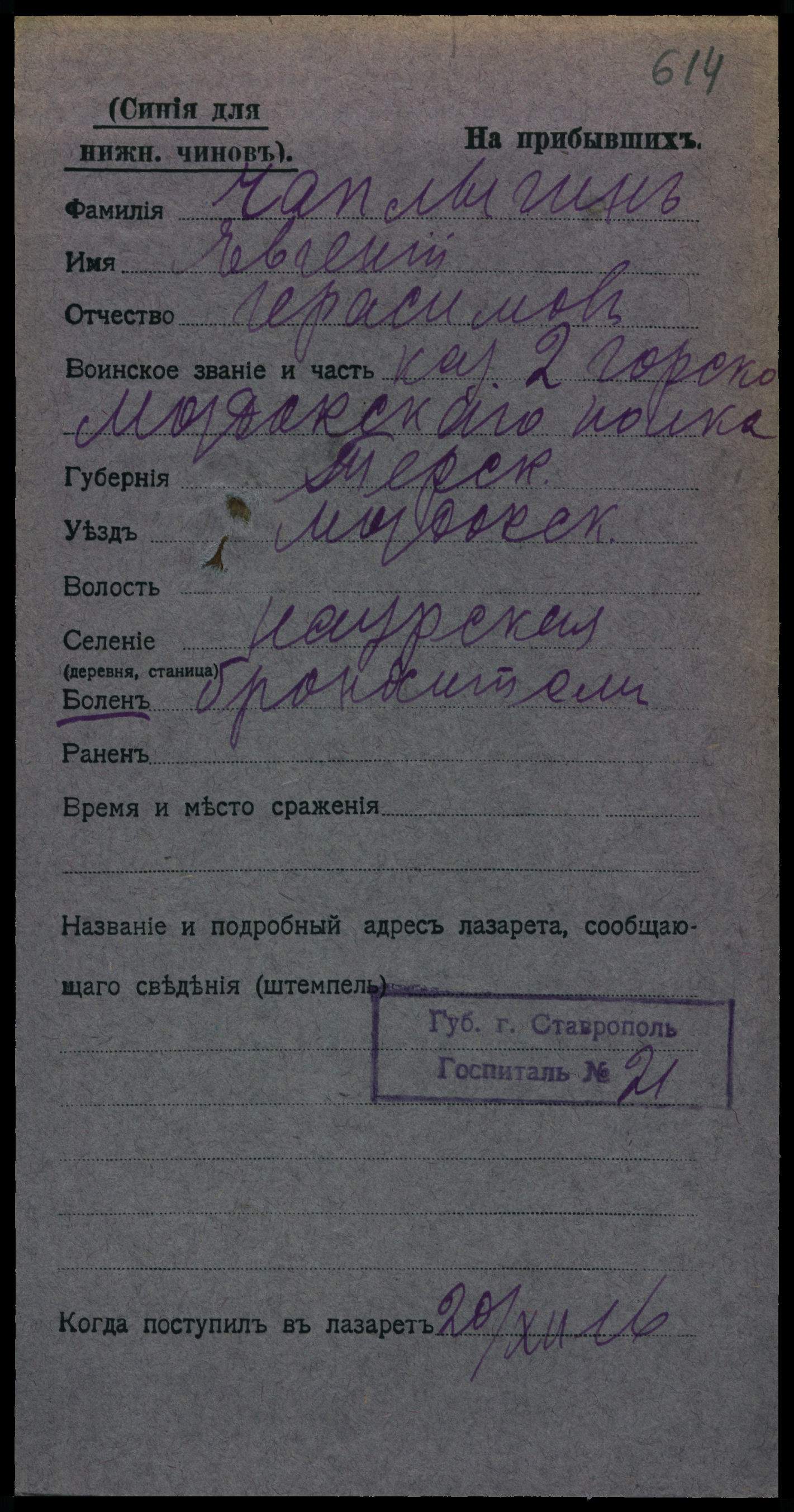 97492 Чаплыгина, Пелагея Николаева, 72 л. Каз. ст. Наурской, Моздокск. отд.; — М. С. 4 уч. Грозненск. окр., 27 Марта 914 (д. №947/913), 2 п. 1112 Акц. У., тюр. 4 м. Исп. 6 Мая 914.