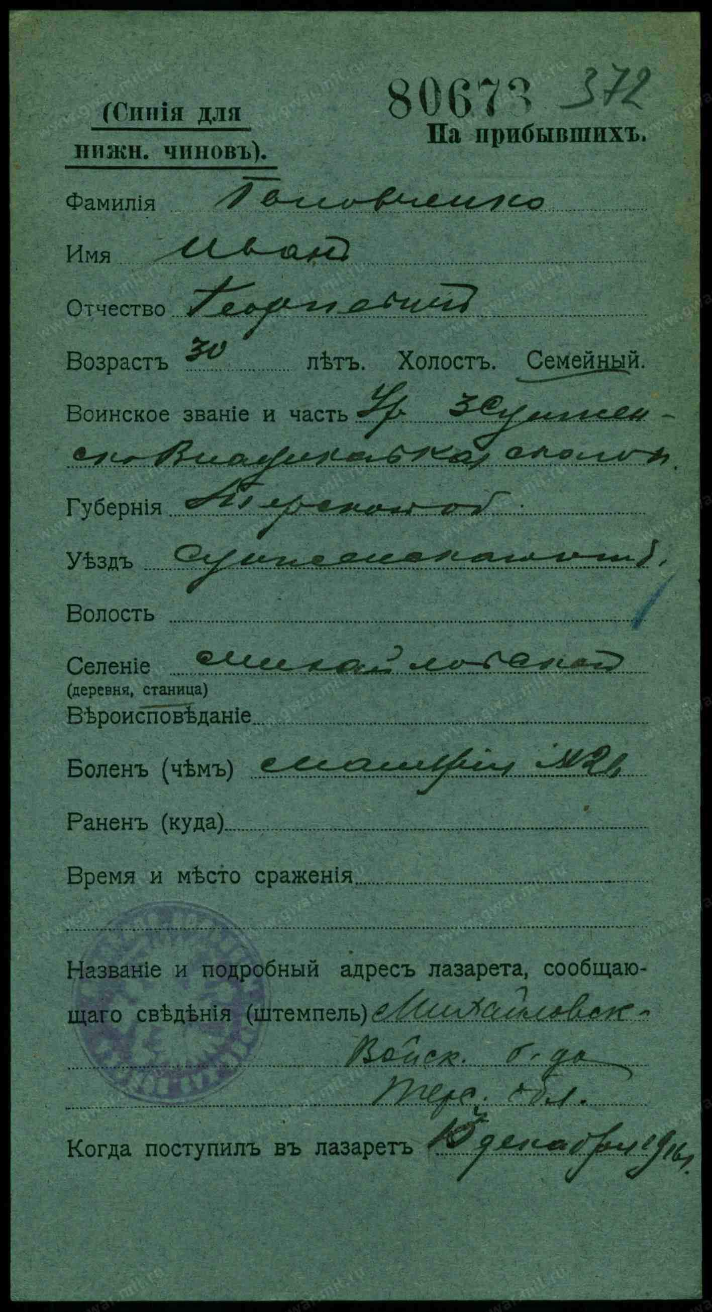 Тип документа Карточка на прибывших (высшие чины)