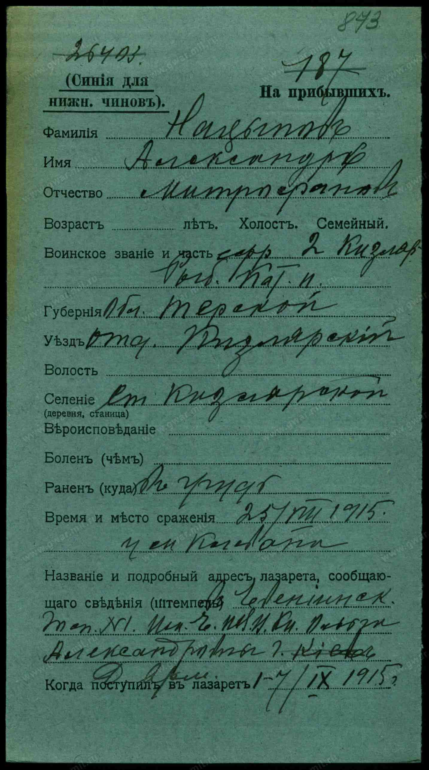 Тип документа Карточка на прибывших (нижние чины)
