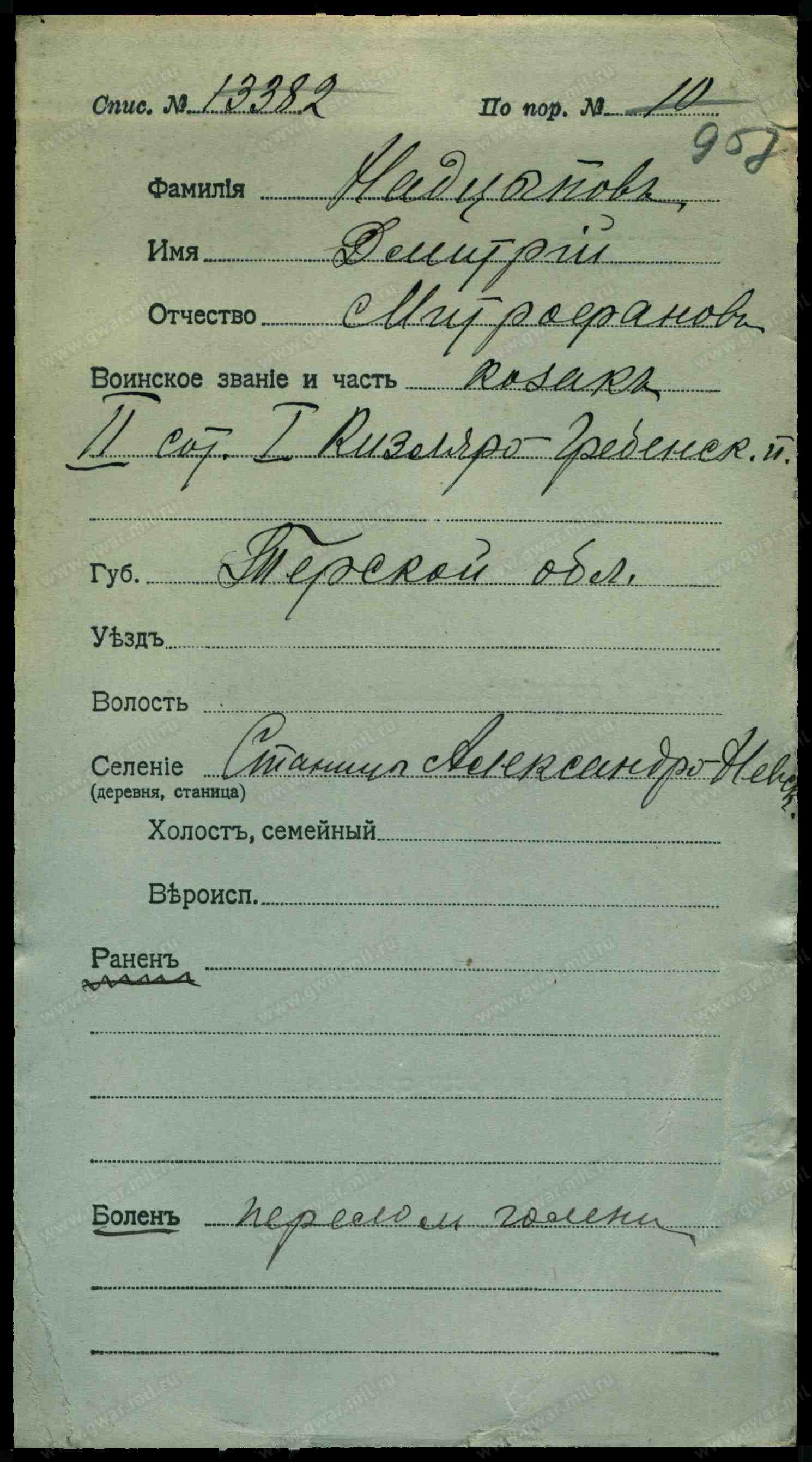 Место рождения Терская обл., Кизлярский отдел