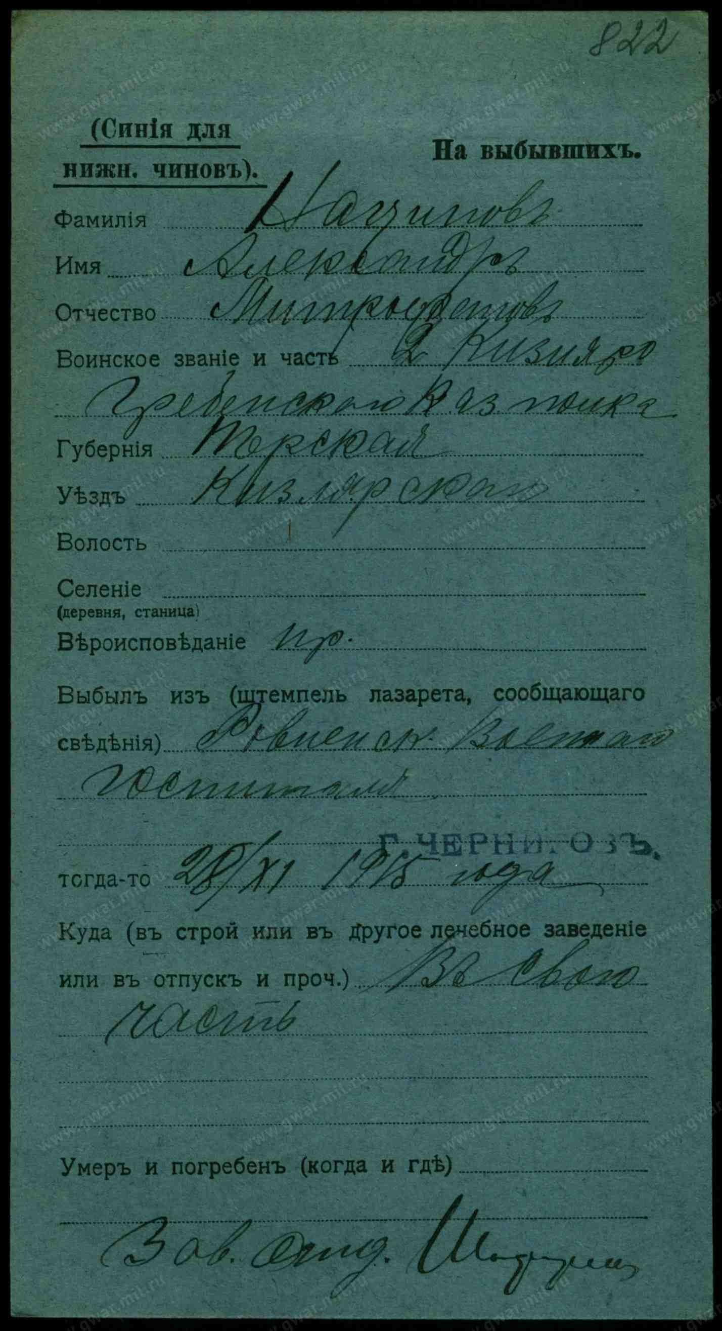 Тип документа Карточка на выбывших (нижние чины)